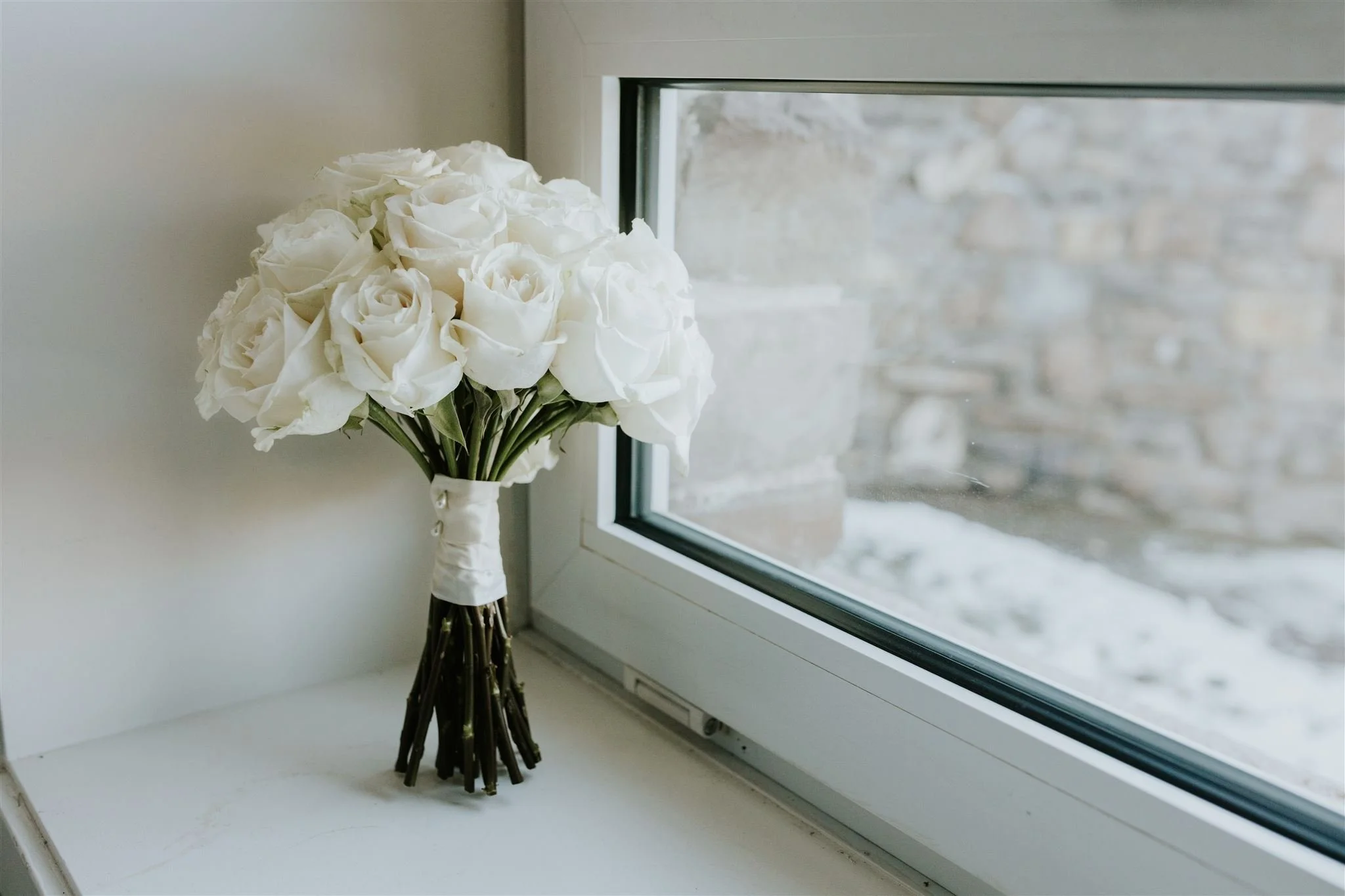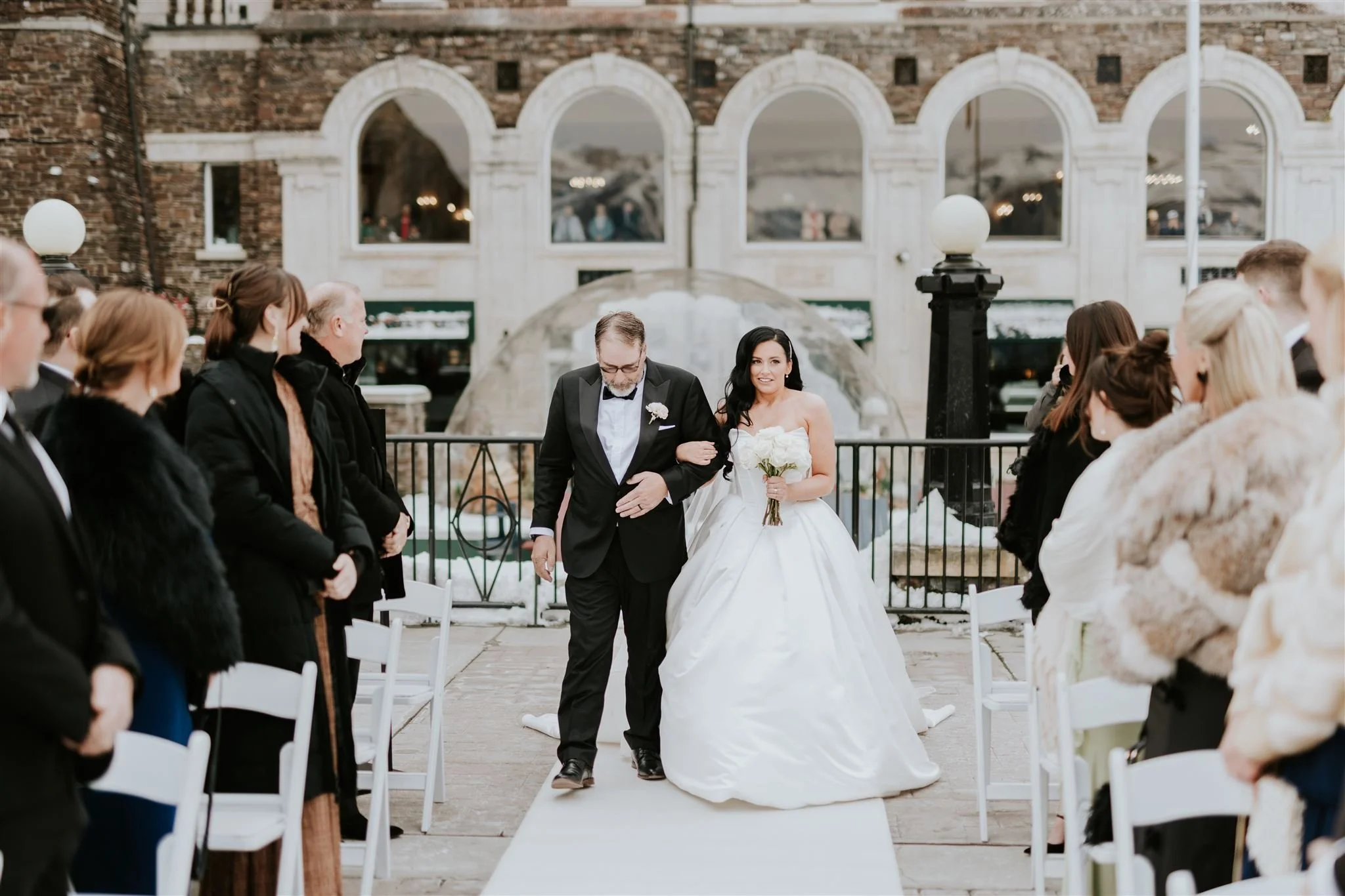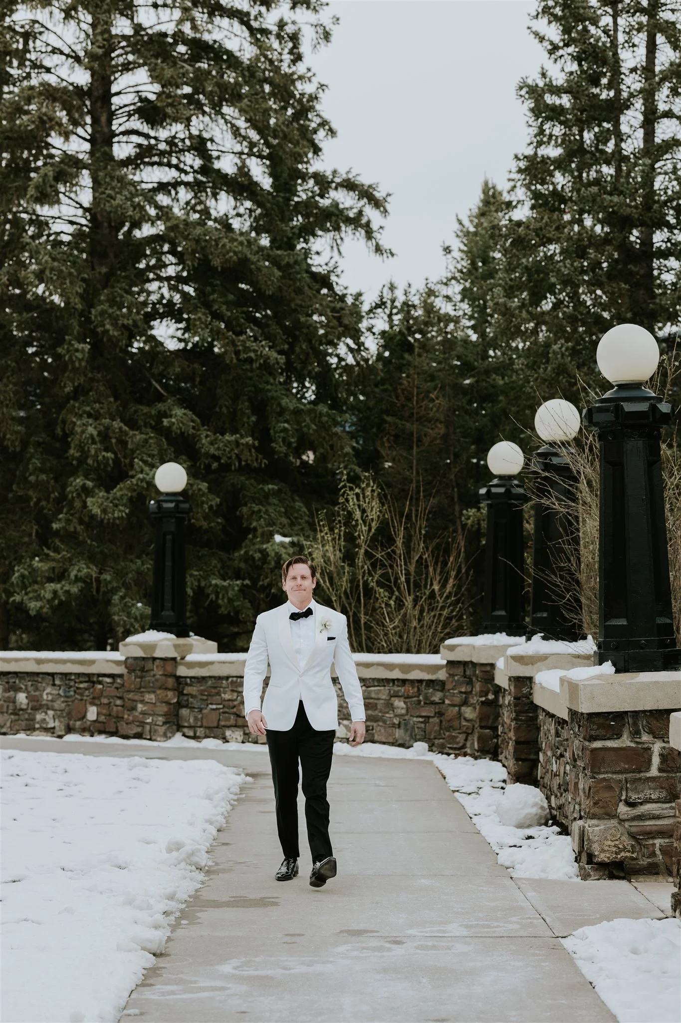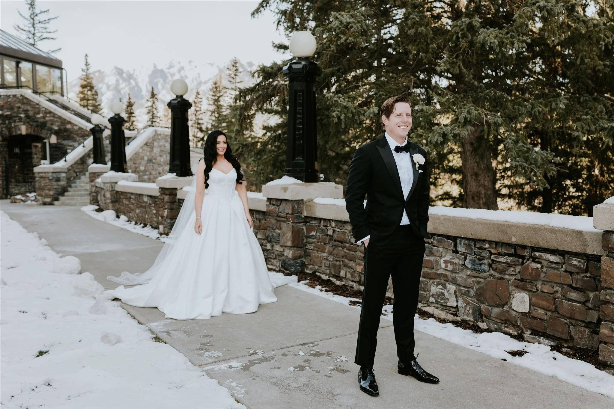 The ceremony took place outdoors at the Fairmont Banff Springs, framed by snow-dusted mountain peaks and brilliant blue skies. Late October in the Rockies can be unpredictable, but the light snowfall in the days leading up to the wedding created a breathtaking alpine backdrop that made the entire setting feel even more dramatic and romantic.