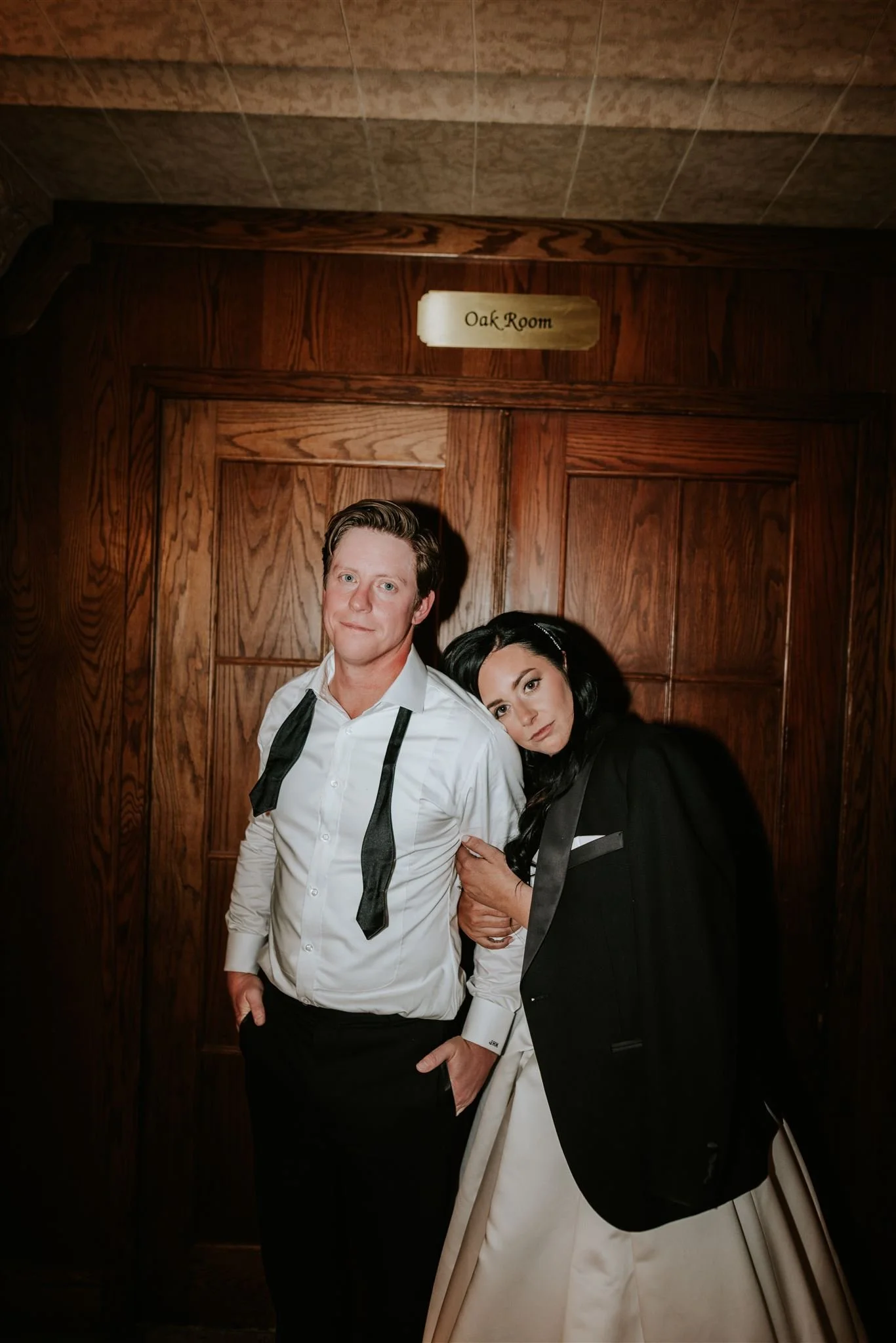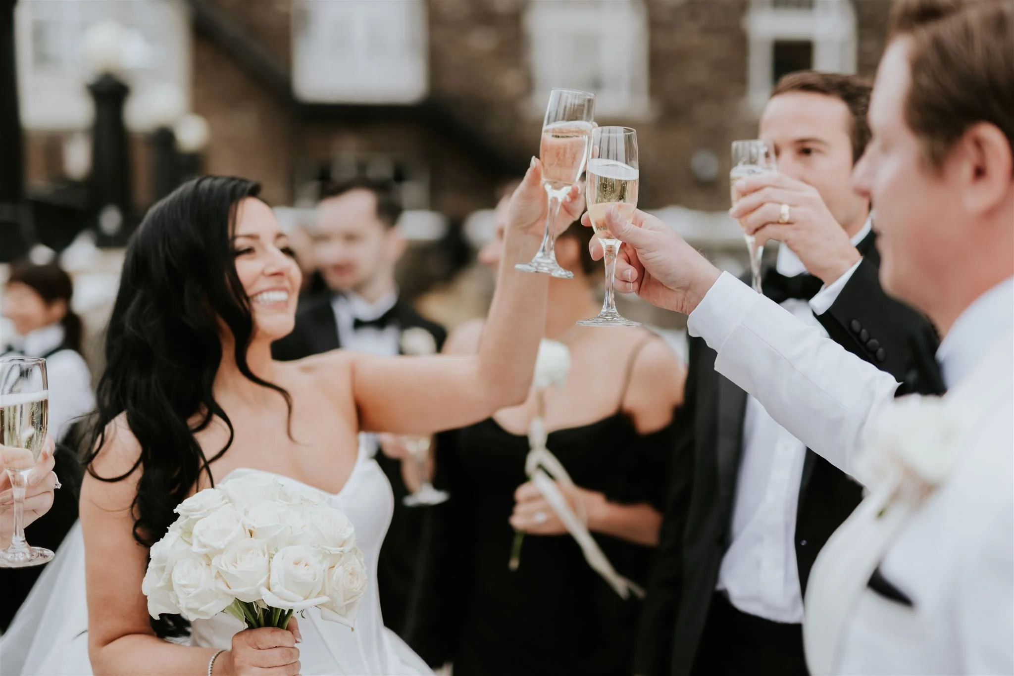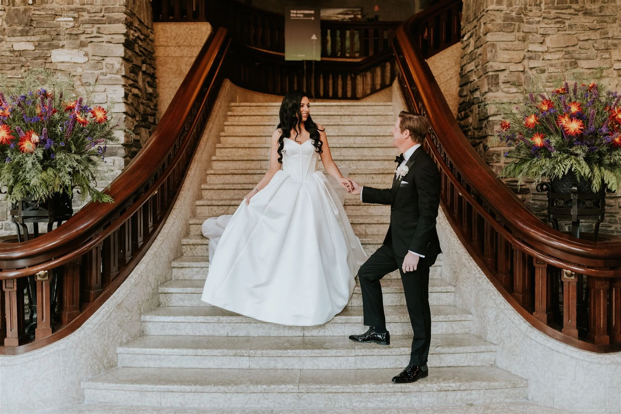 Taylor looked every bit the classically stunning bride. Her gown featured a structured strapless bodice with elegant corset-style boning and a softly sculpted sweetheart neckline that flowed into a full, sweeping skirt. Paired with her long dark hair styled in glamorous Hollywood waves by Blush & Coco, the look felt timeless and cinematic. John complemented the look perfectly, wearing a traditional black tuxedo for the first look and changing into a crisp white dinner jacket with black trousers and a black bow tie for the ceremony, a refined nod to old-Hollywood elegance.