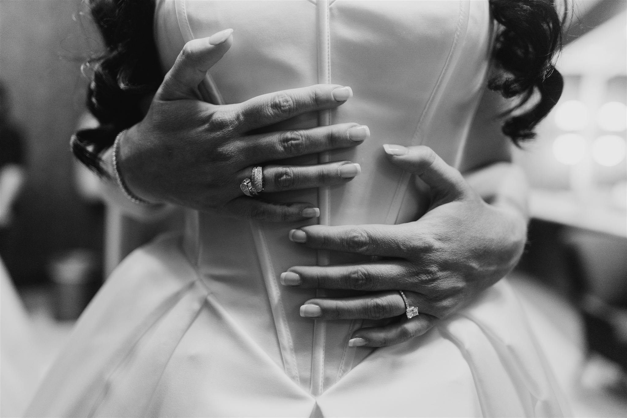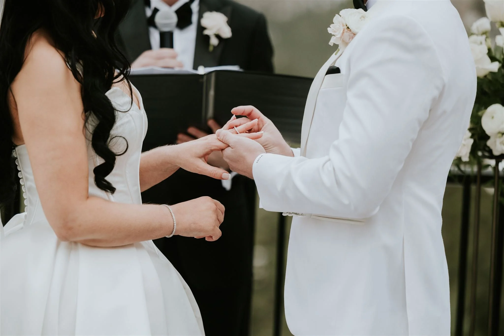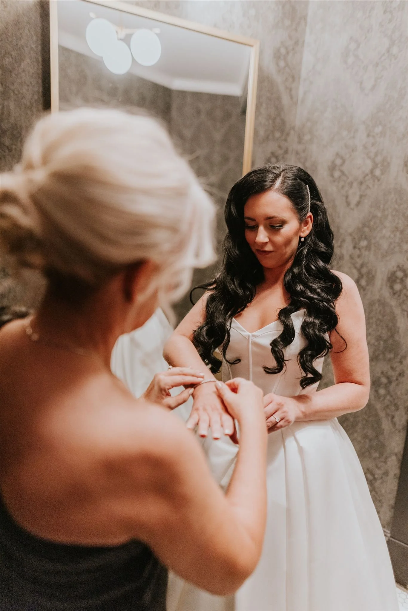 Taylor looked every bit the classically stunning bride. Her gown featured a structured strapless bodice with elegant corset-style boning and a softly sculpted sweetheart neckline that flowed into a full, sweeping skirt. Paired with her long dark hair styled in glamorous Hollywood waves by Blush & Coco, the look felt timeless and cinematic. John complemented the look perfectly, wearing a traditional black tuxedo for the first look and changing into a crisp white dinner jacket with black trousers and a black bow tie for the ceremony, a refined nod to old-Hollywood elegance.