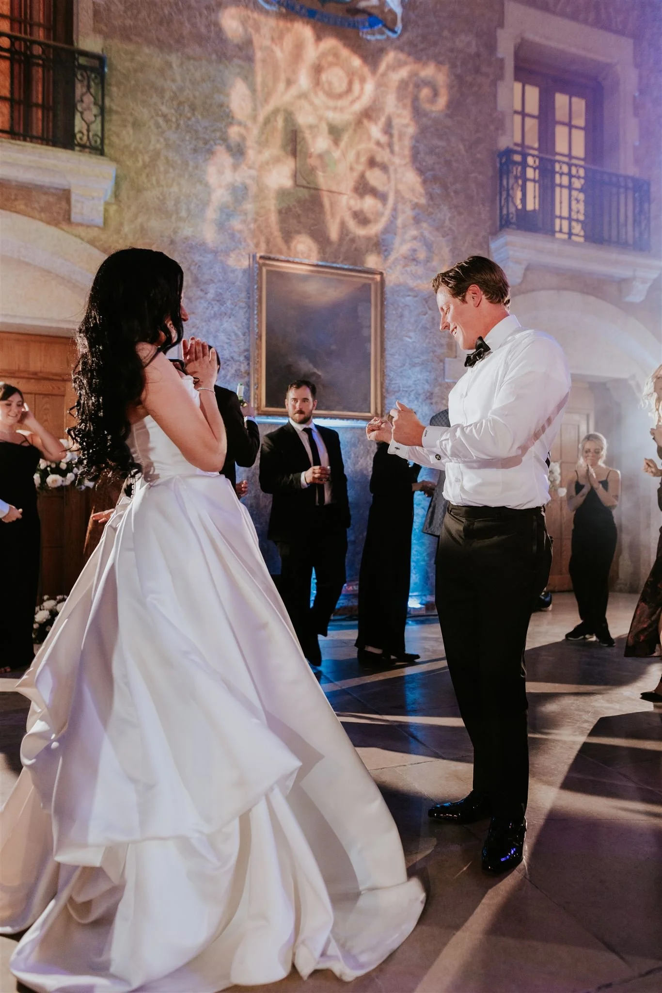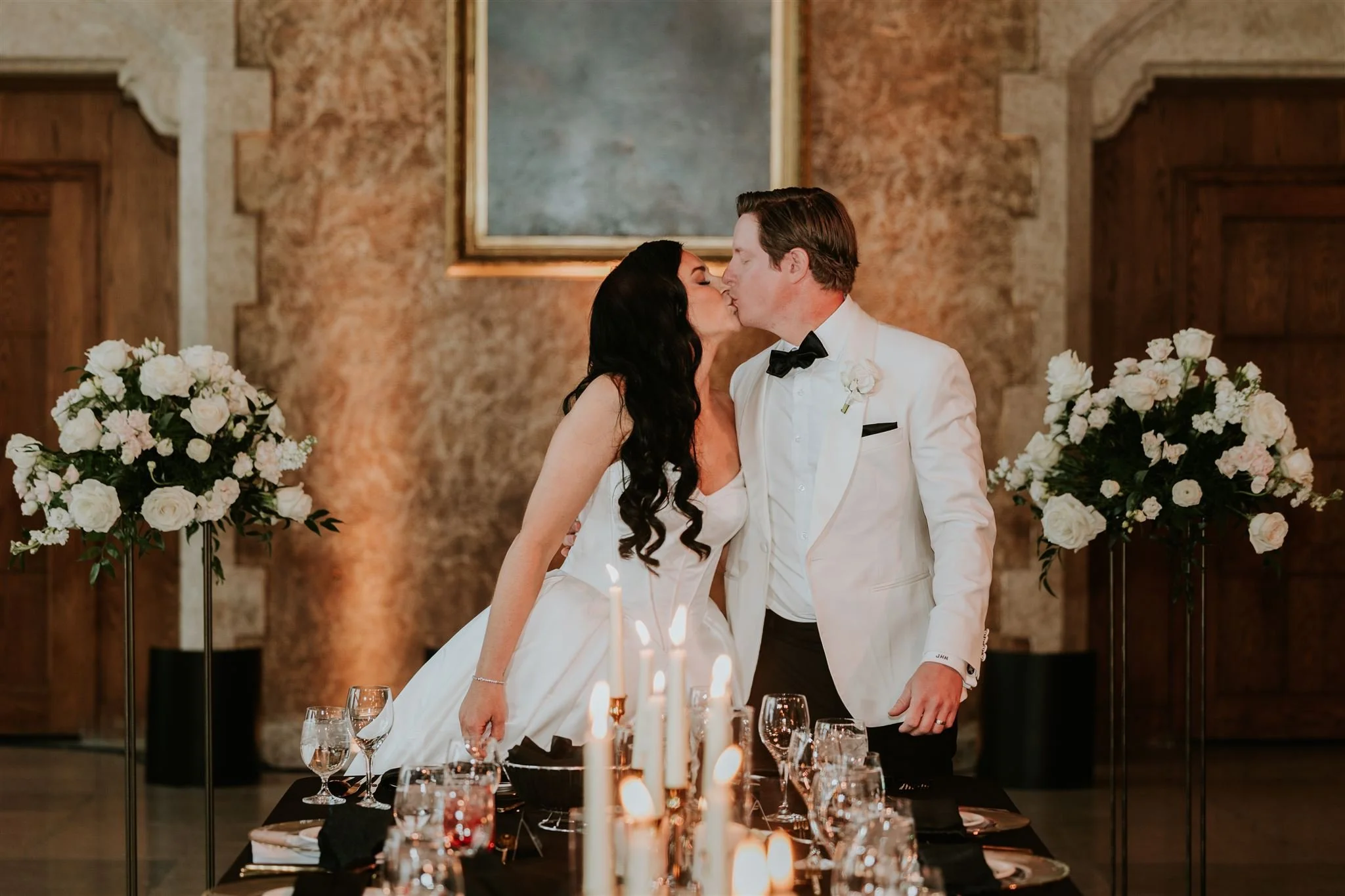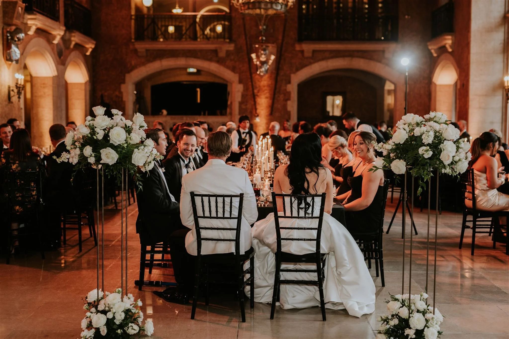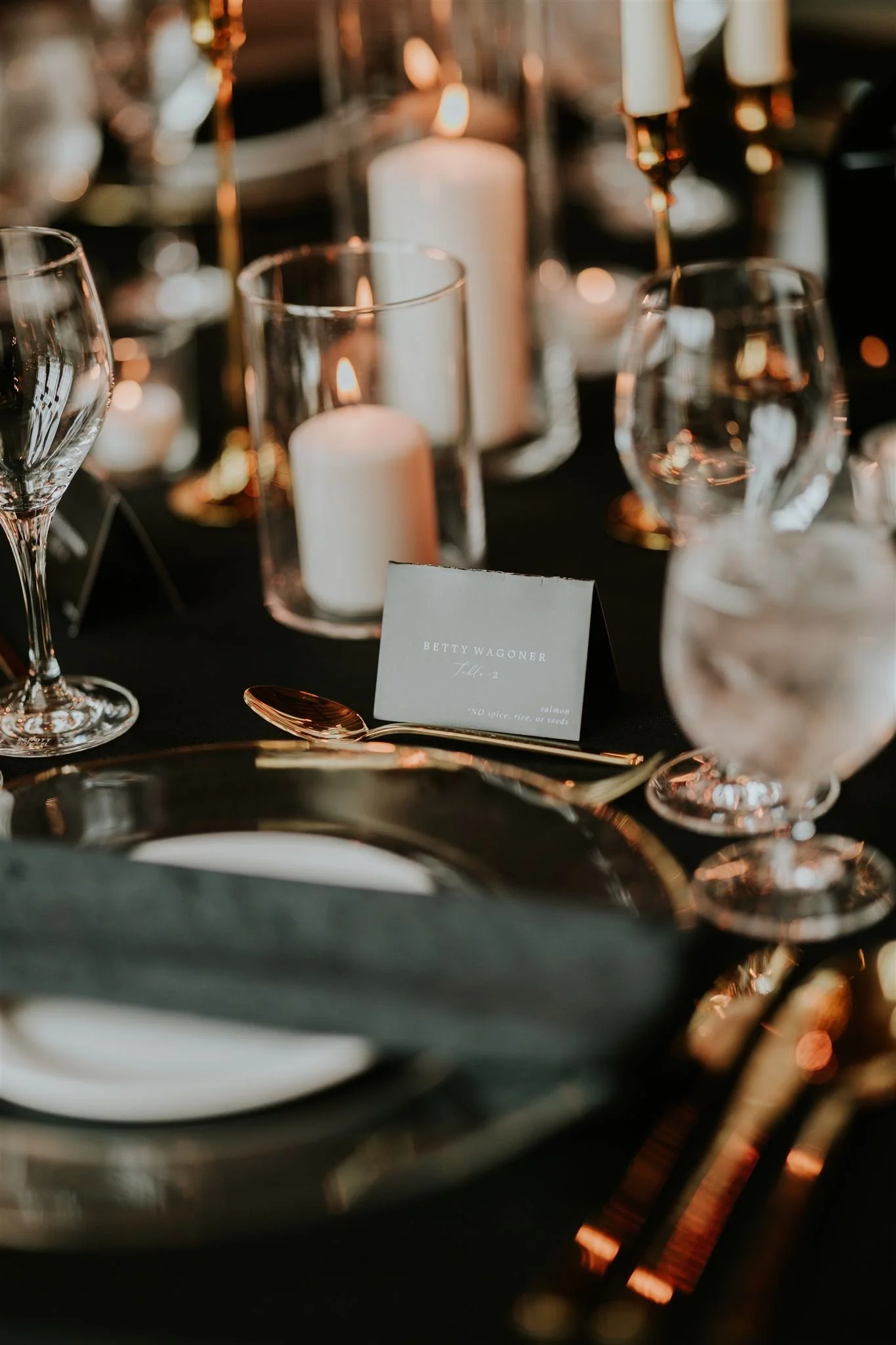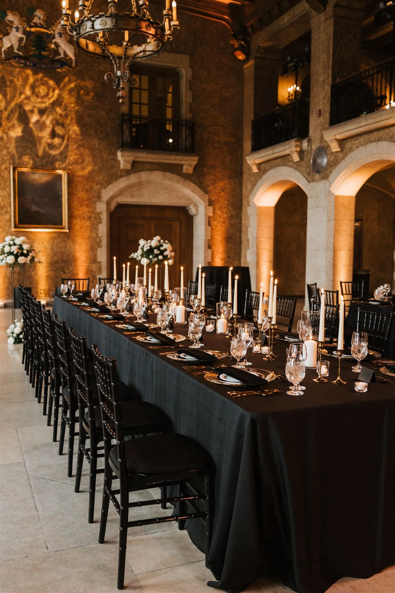 Taylor carried a bouquet of classic white roses designed by Blue Lake Florals, whose arrangements brought a soft elegance to the ceremony space and reception. The couple’s black-and-white design palette carried throughout the entire celebration, creating a look that was both modern and timeless. With décor rentals provided by Mountain Event Rentals, the reception space featured black chairs, black linens, and elegant tablescapes accented with gold-rimmed charger plates, gold candle holders with tall white tapers, and understated black table numbers. The combination felt incredibly polished and sophisticated.
