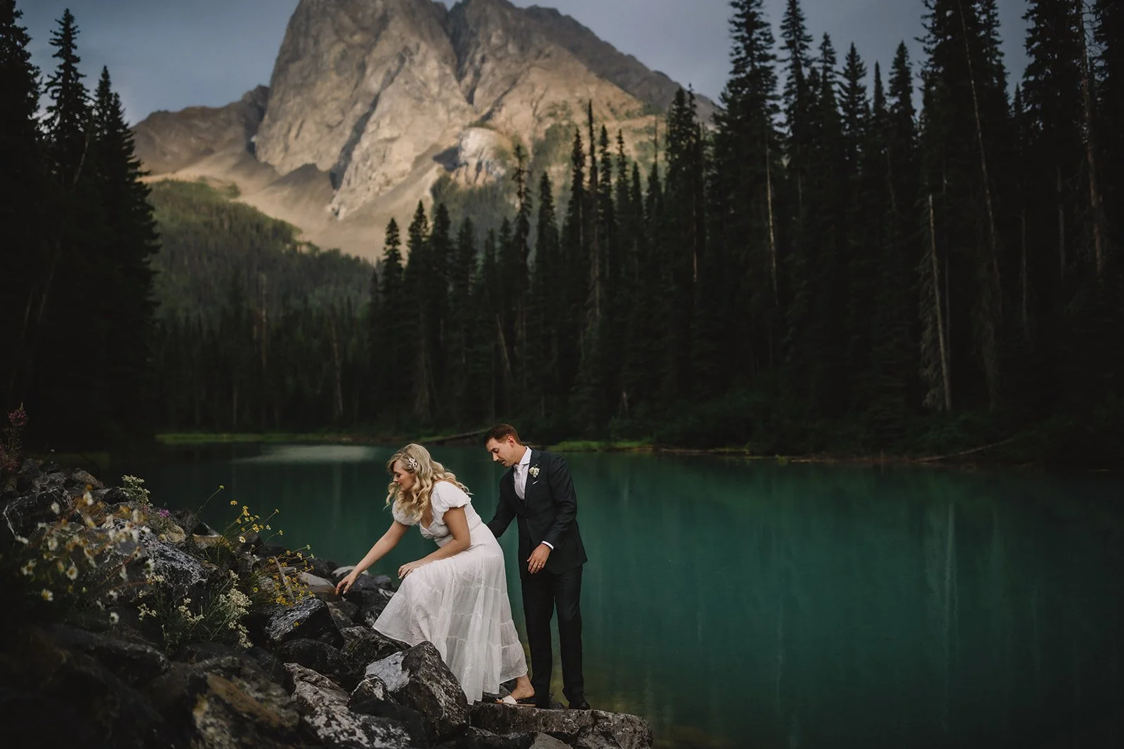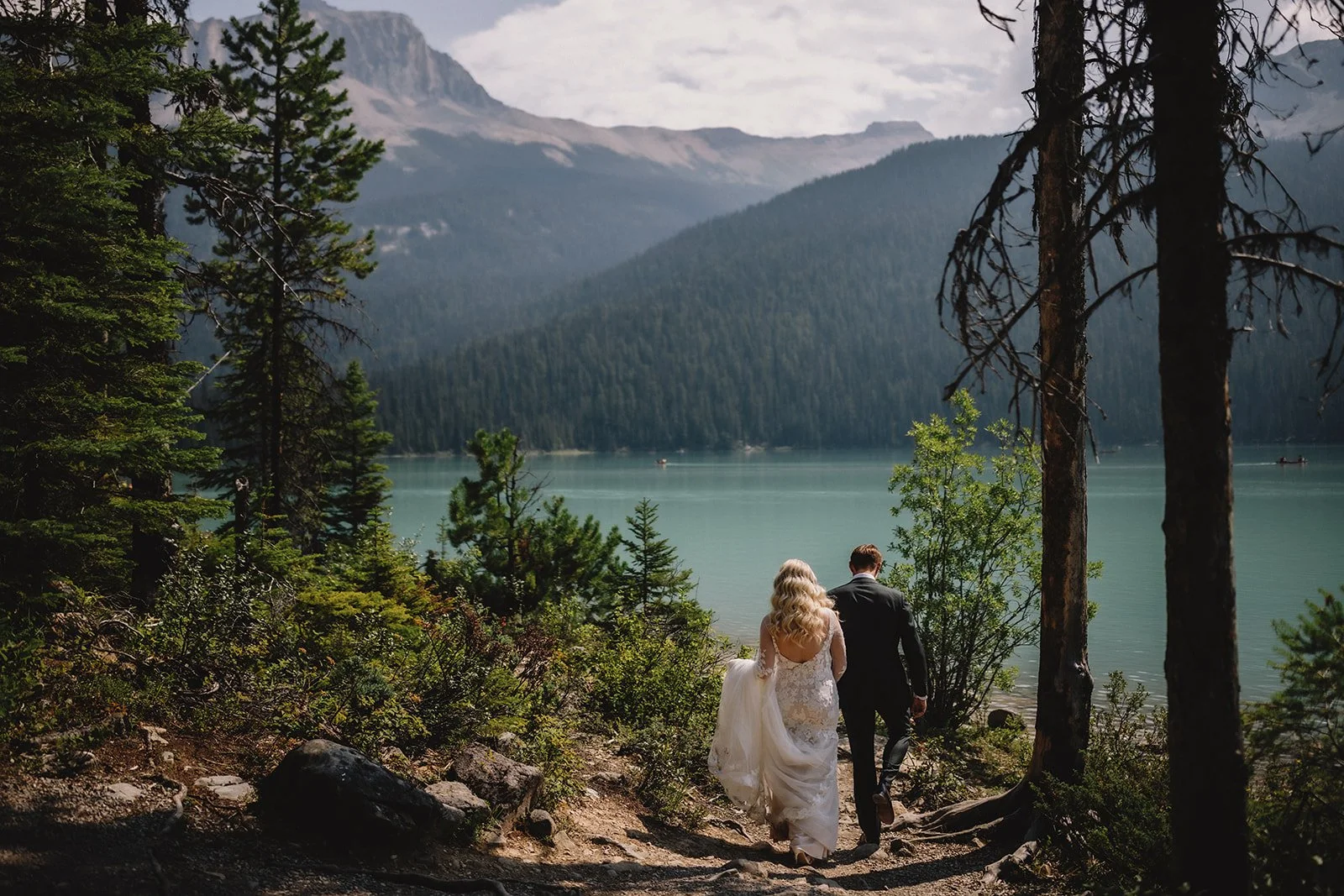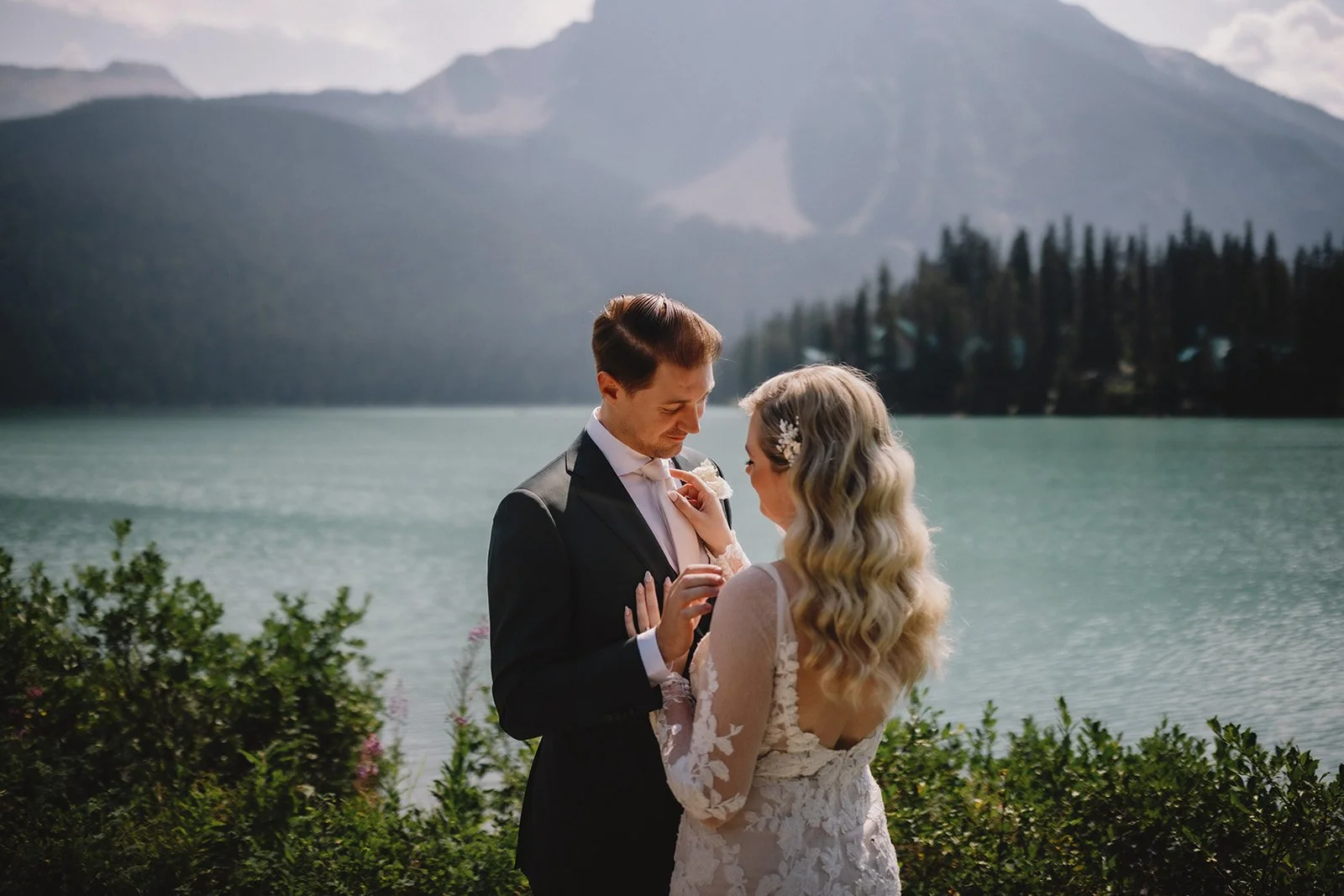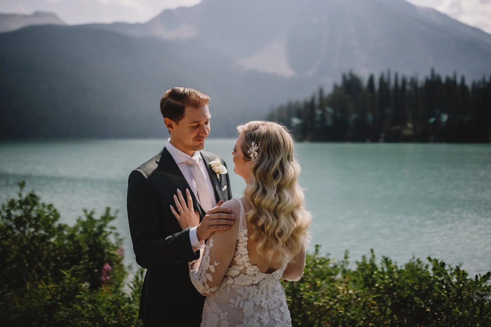 They chose to begin the day with a private first look near the lodge, captured by Gabe McClintock. It gave them a quiet moment together before everything began and set the tone for a day that felt intentional without being over-scheduled. From there, they moved into portraits around Emerald Lake, making the most of the turquoise water and mountain backdrop.