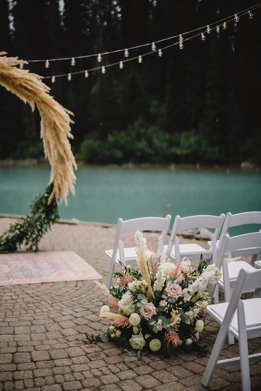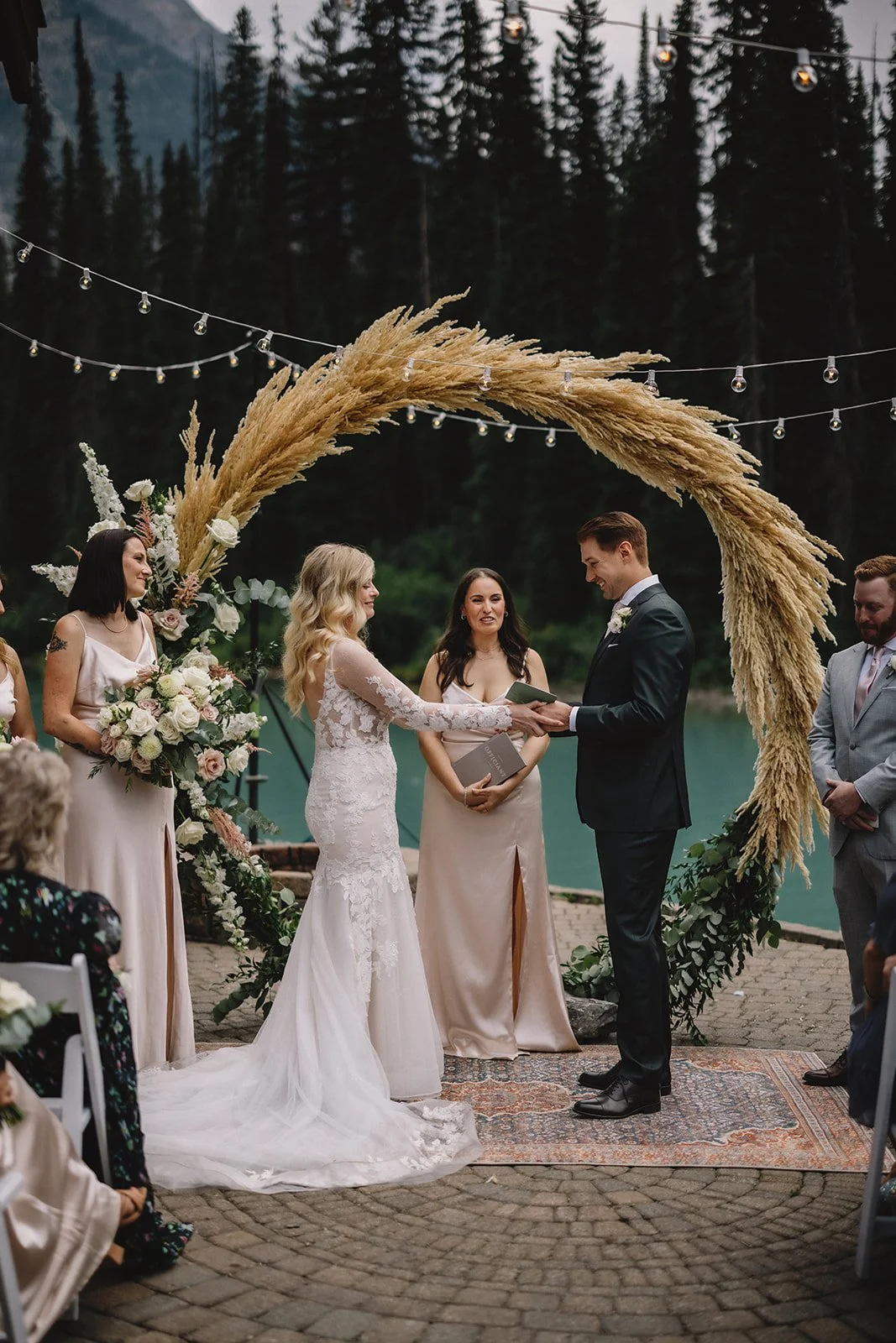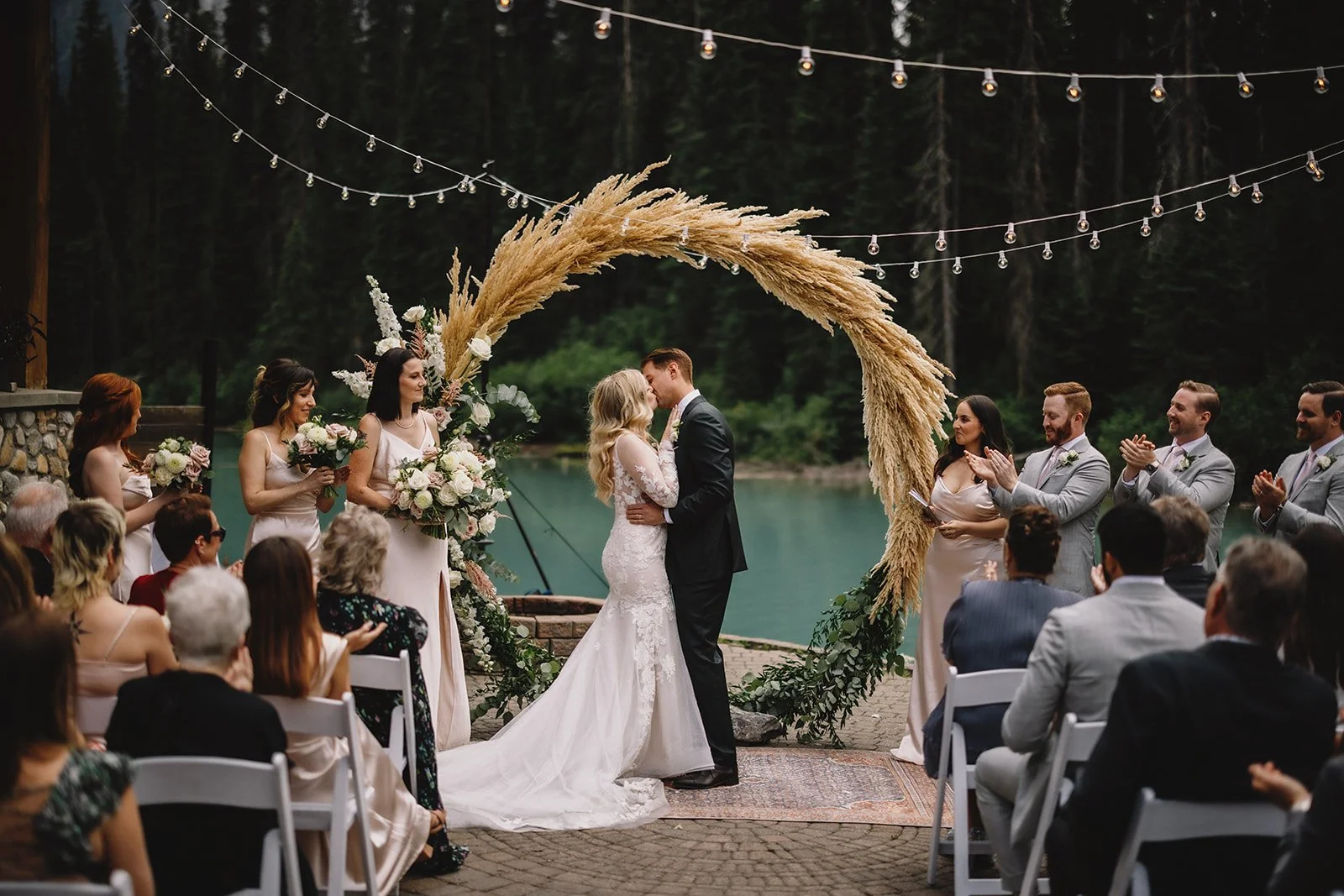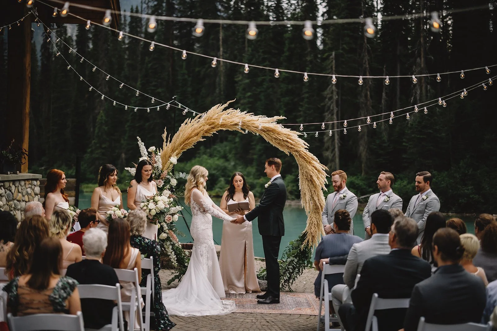 The ceremony took place on the patio overlooking the lake, with gorgeous florals from Willow Flower Co. A gold circular arch anchored the space, softened with florals, while string lighting by Silvermoon Productions added a subtle glow overhead.