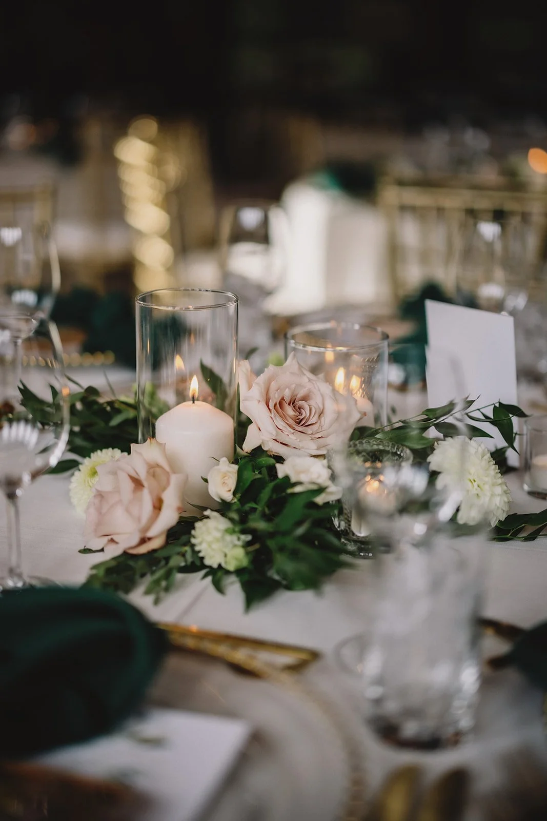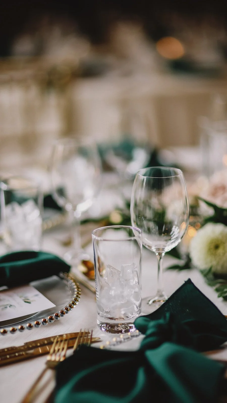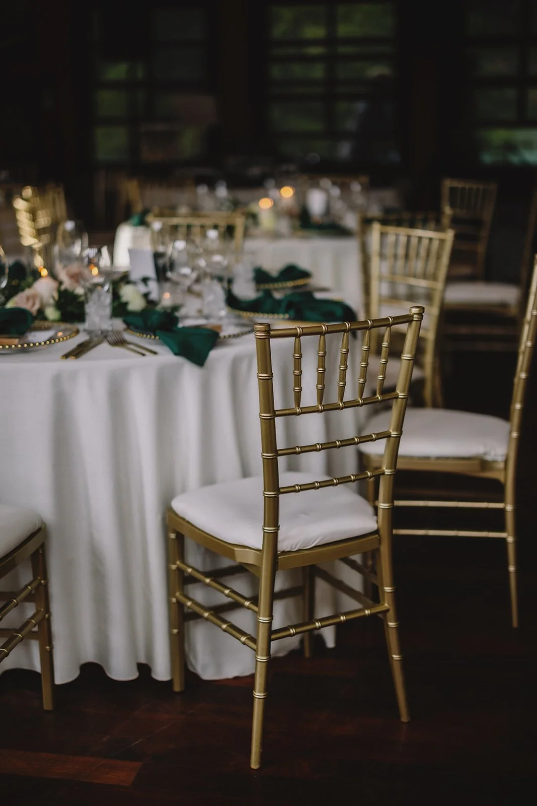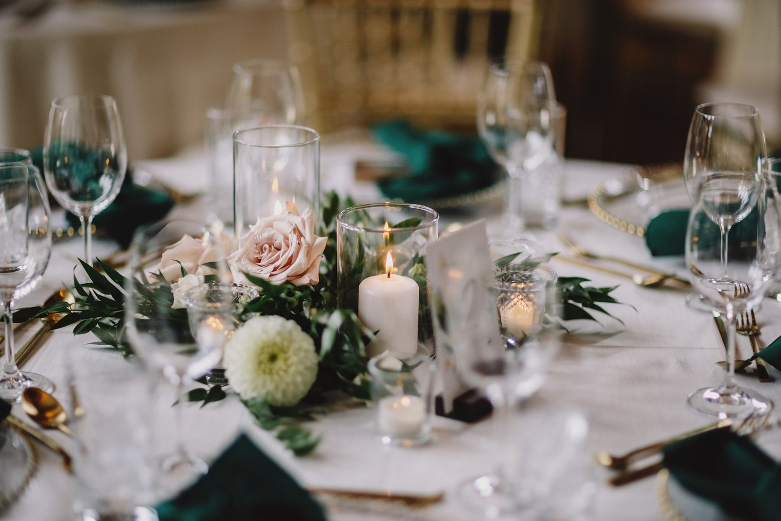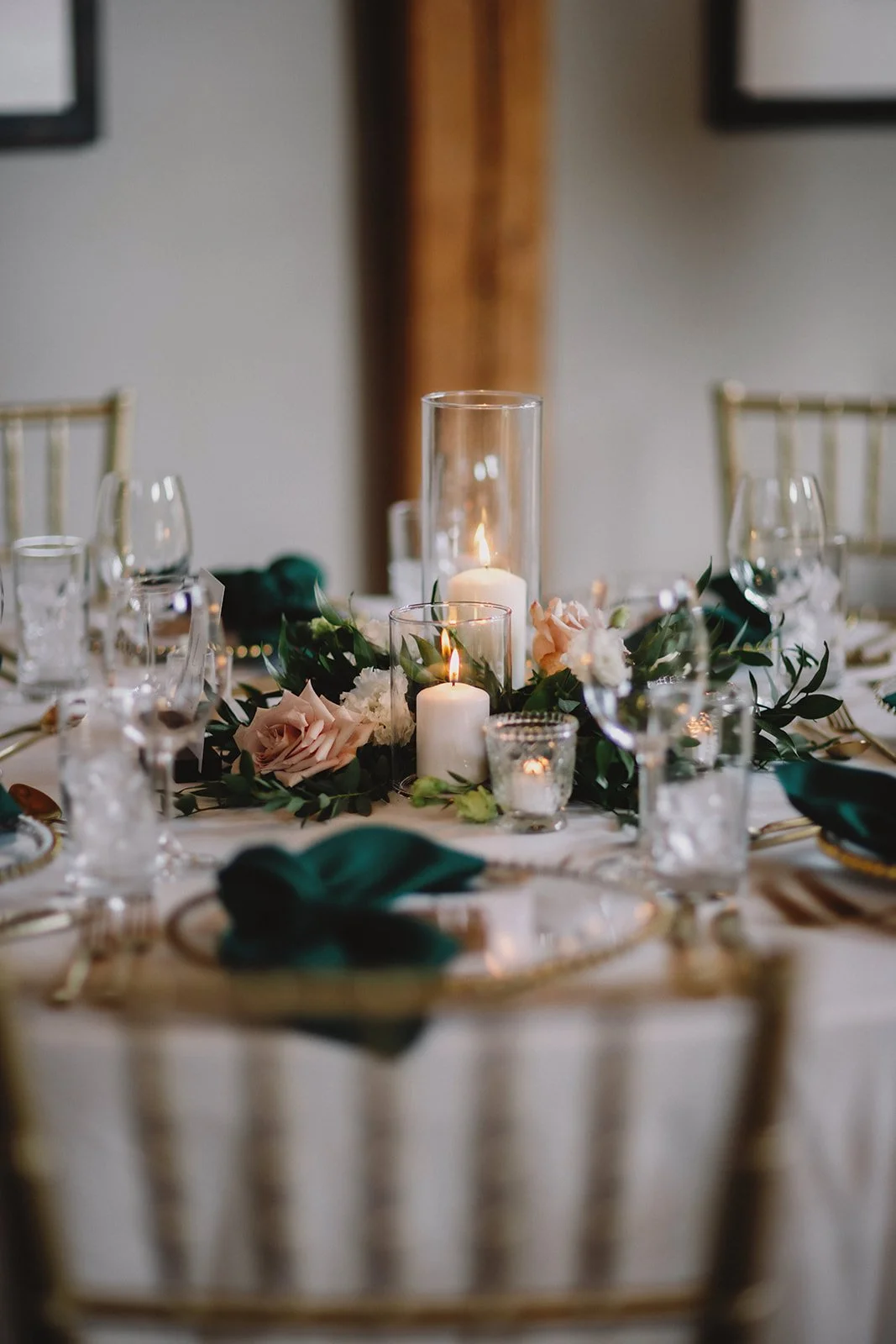 For the reception, guests moved into Cilantro on the Lake, where the design leaned into a refined boho feel. Ivory linens from Mountain Event Rentals, gold cutlery and chargers, and gold chiavari chairs were layered with deep green napkins and soft blush florals by Willow Flower Co. Candlelight and thoughtful table styling added depth without feeling overdone.