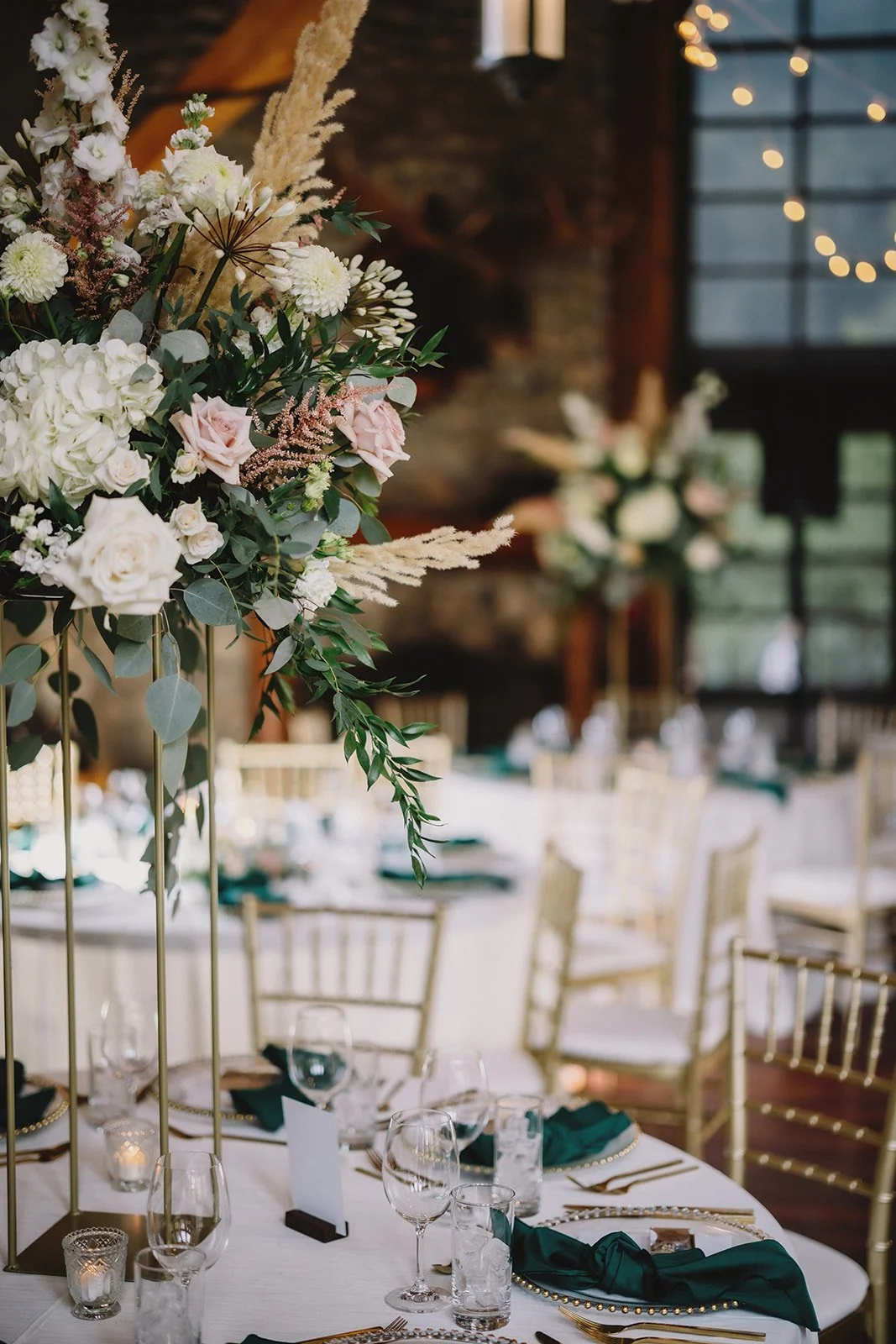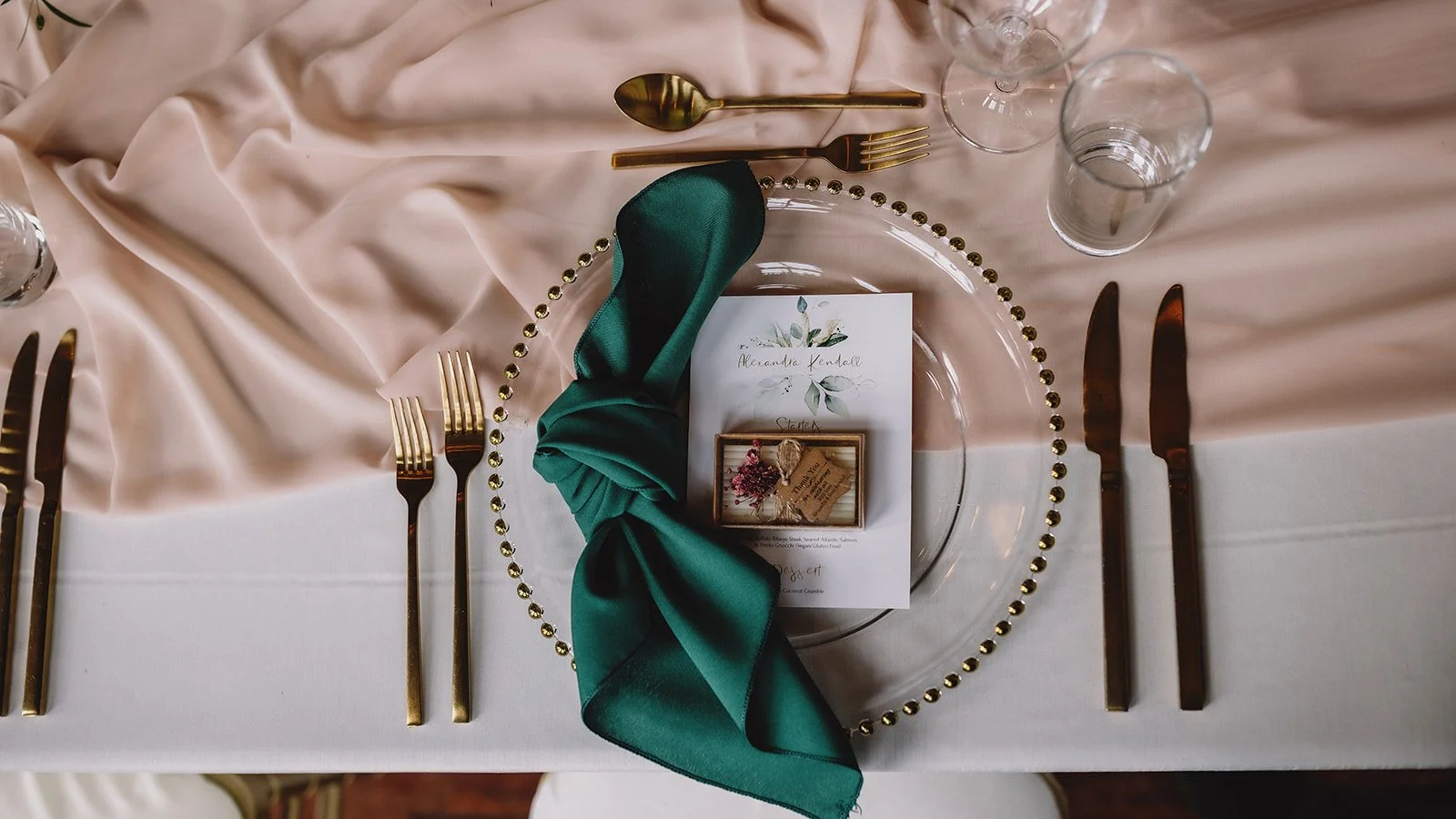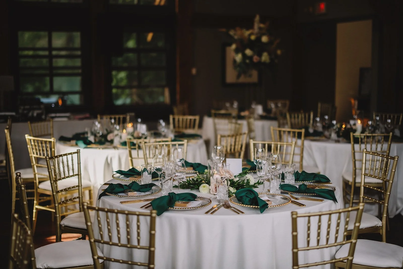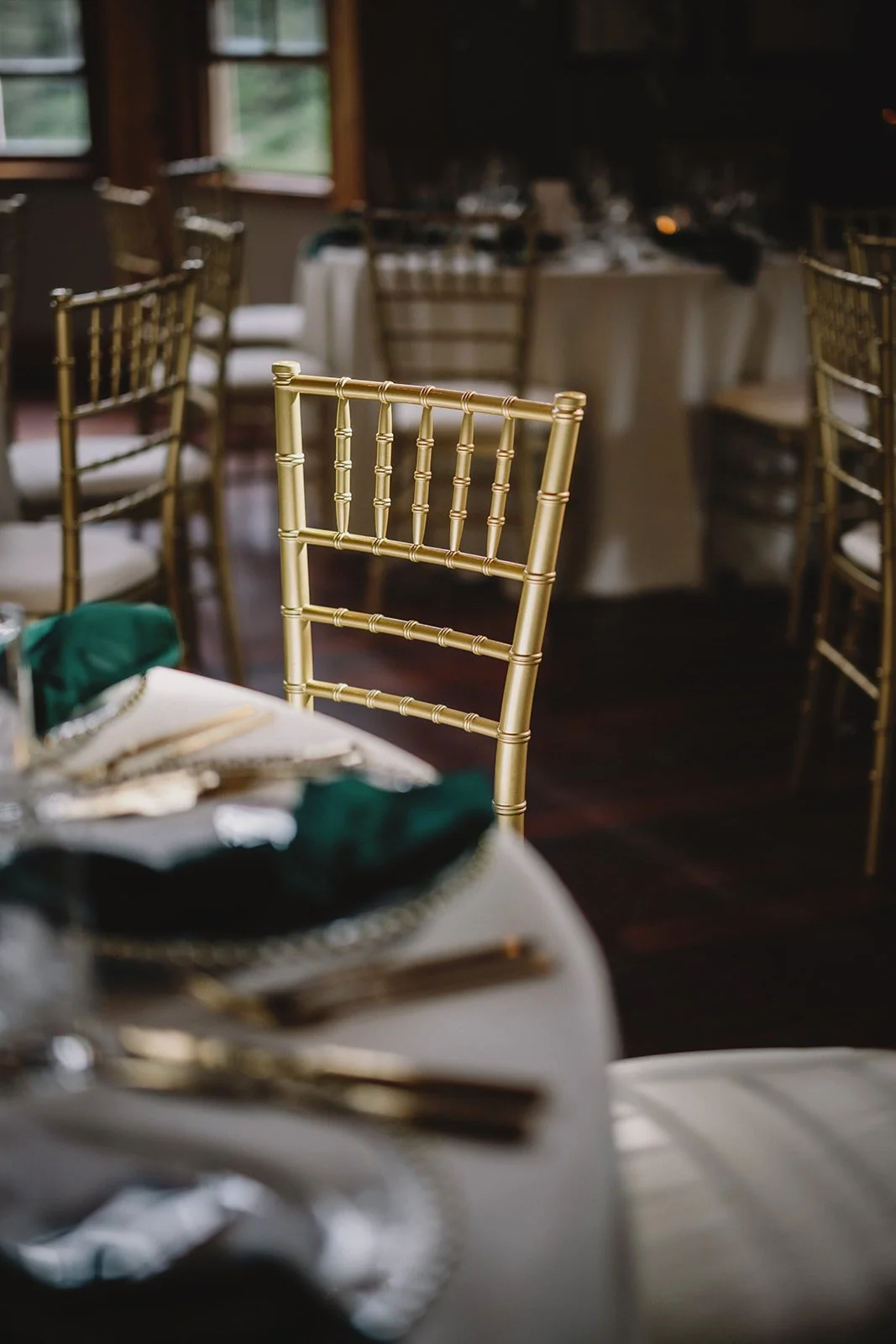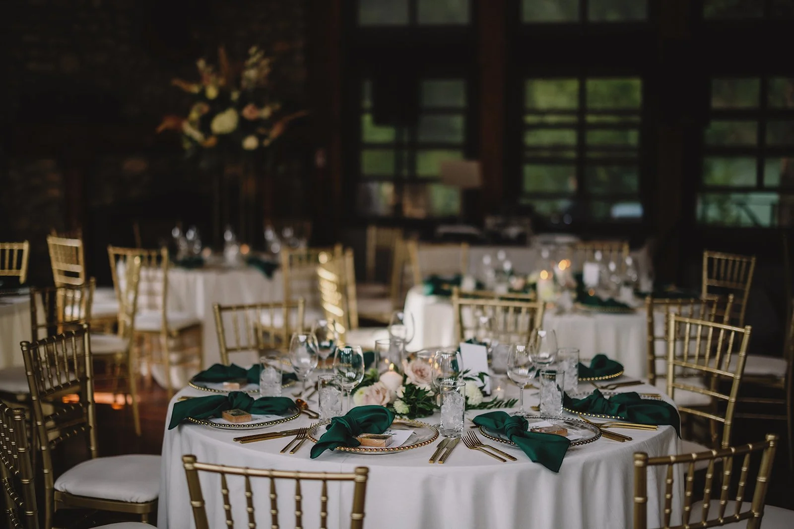 For the reception, guests moved into Cilantro on the Lake, where the design leaned into a refined boho feel. Ivory linens from Mountain Event Rentals, gold cutlery and chargers, and gold chiavari chairs were layered with deep green napkins and soft blush florals by Willow Flower Co. Candlelight and thoughtful table styling added depth without feeling overdone.