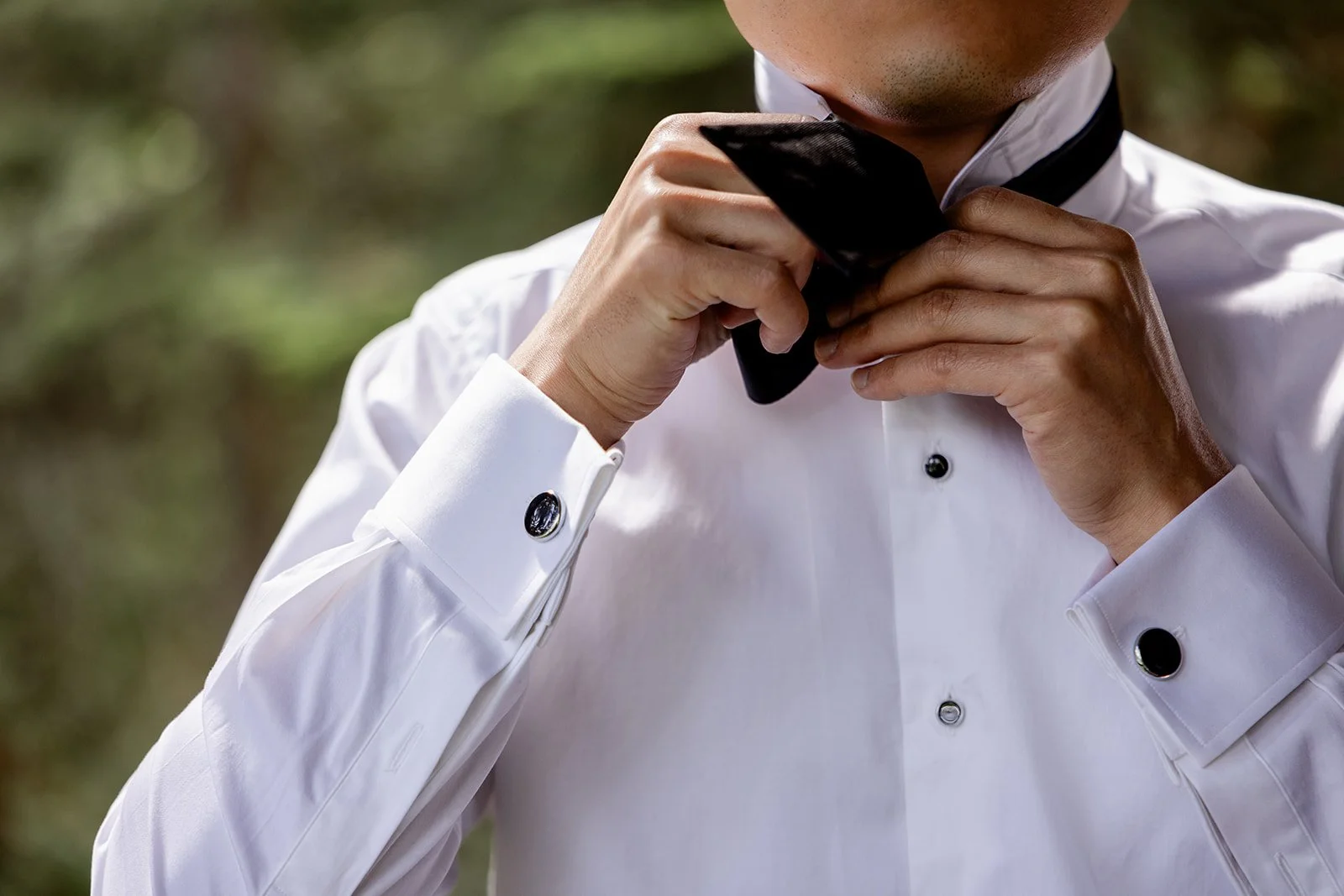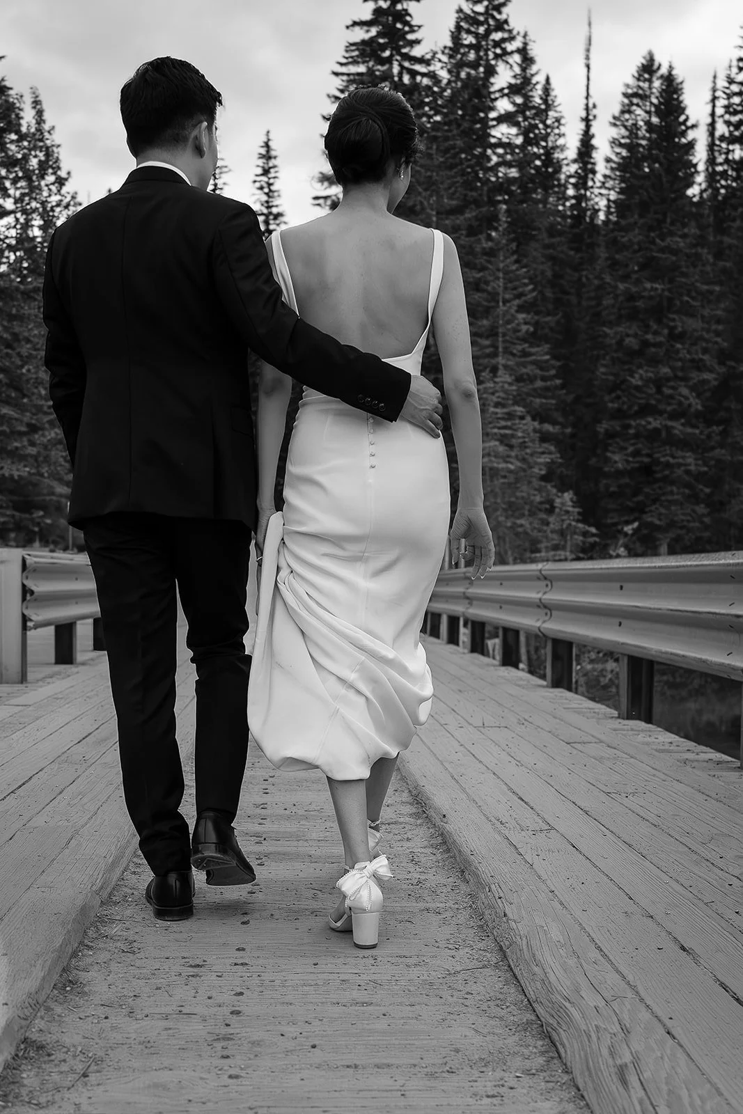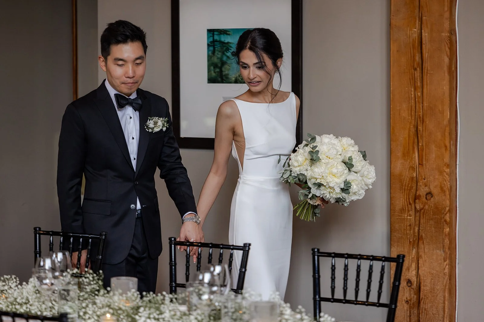 The aesthetic carried through in timeless black and white. Classic black suits, soft white florals, and clean, elevated rentals from Mountain Event Rentals created a look that was cohesive, modern, and quietly striking. Commissioner Klaus Ohloff led a ceremony that balanced heartfelt emotion with moments of lightness, while live music by Solatido added a soft, romantic atmosphere.