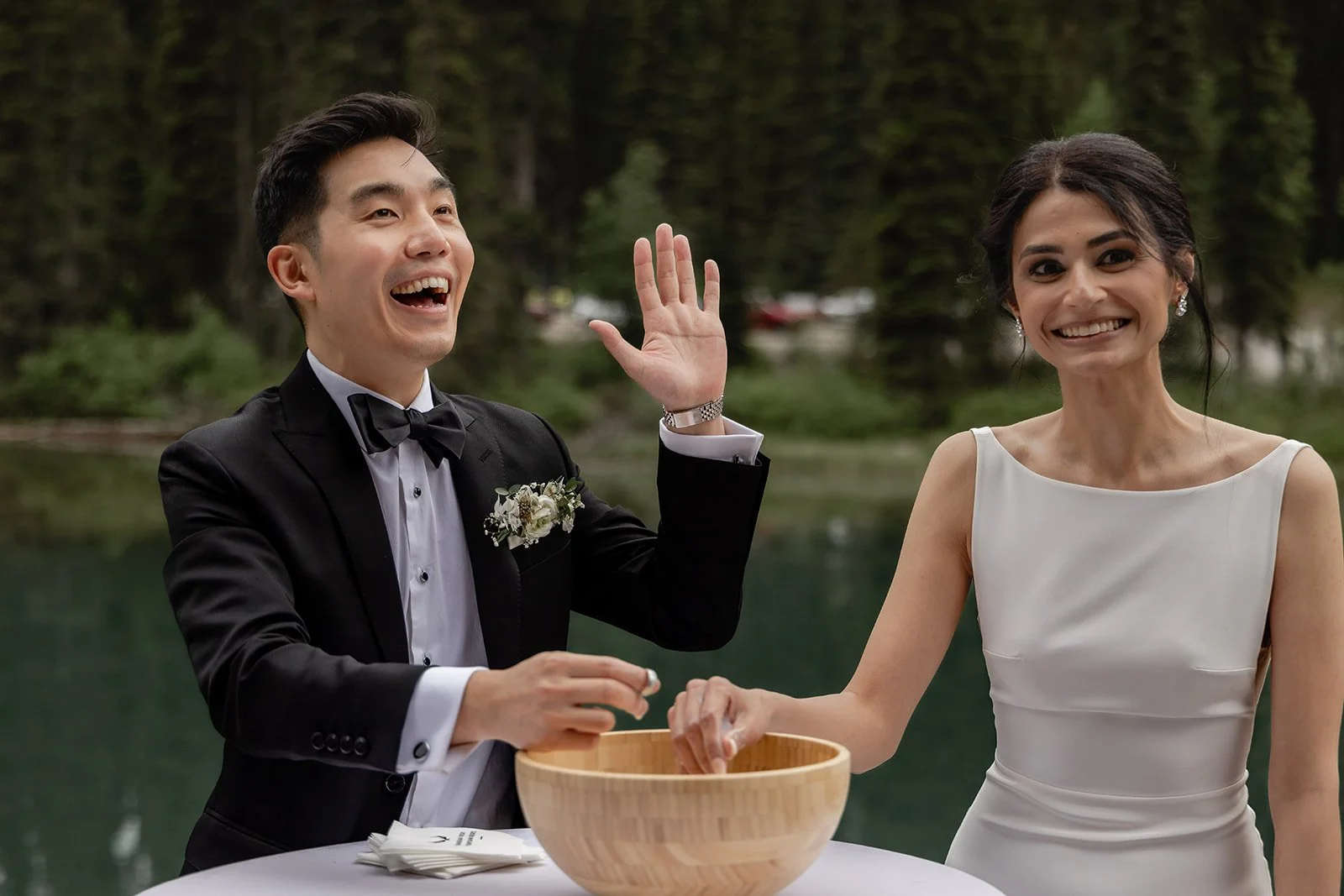 Amanpreet and Sam’s wedding at Emerald Lake Lodge was the definition of understated luxury in one of the most breathtaking settings in the Rockies. With its vibrant turquoise water, towering mountain backdrop, and dense forest surroundings, Emerald Lake offers the feeling of a secluded, backcountry escape without sacrificing comfort or convenience. Just over an hour from Lake Louise, it’s a world-class venue that feels both remote and effortlessly refined.