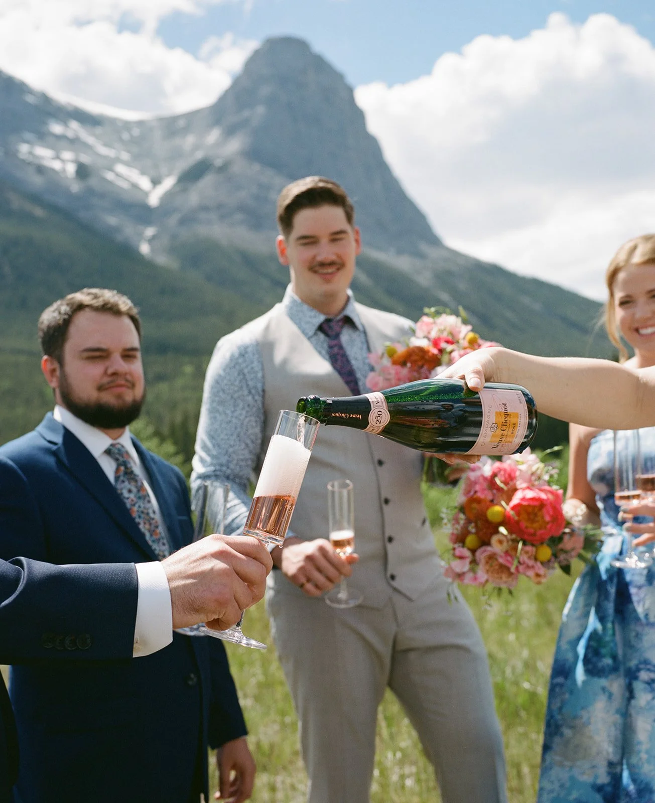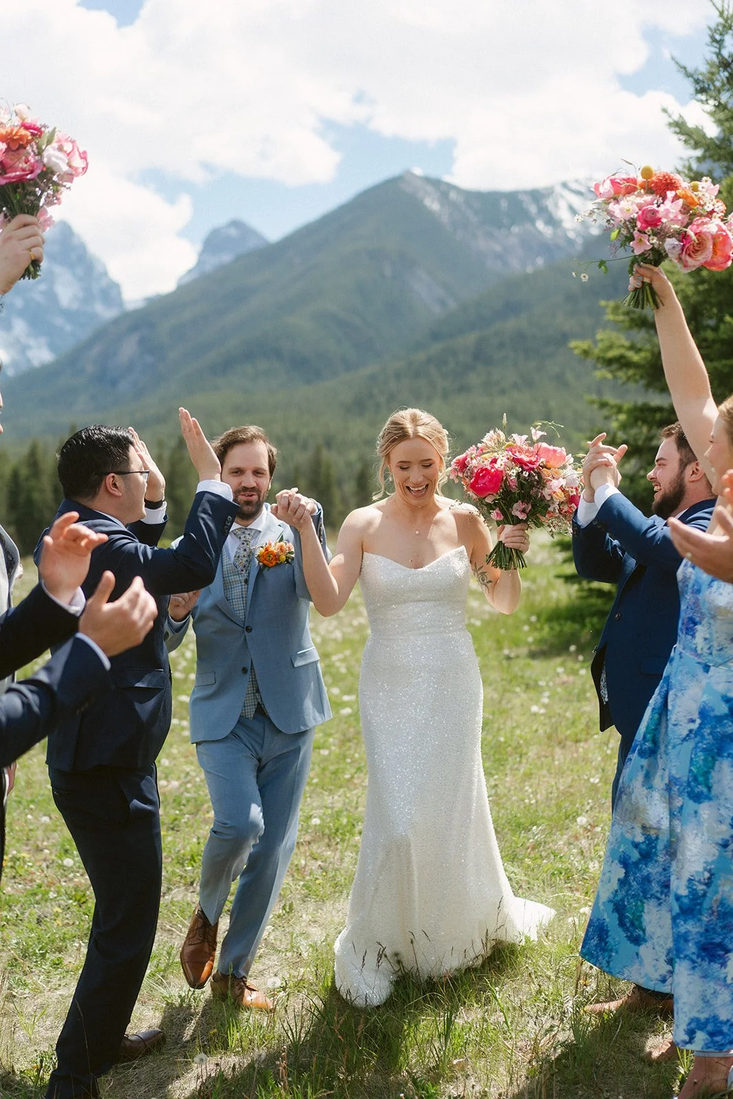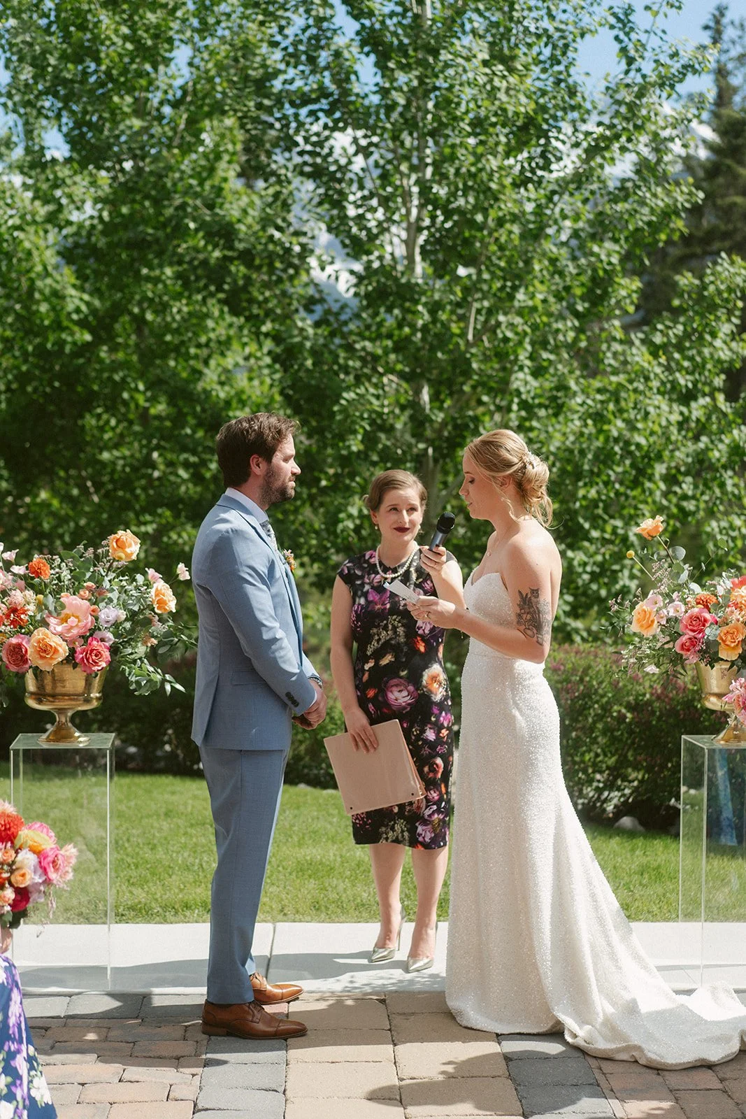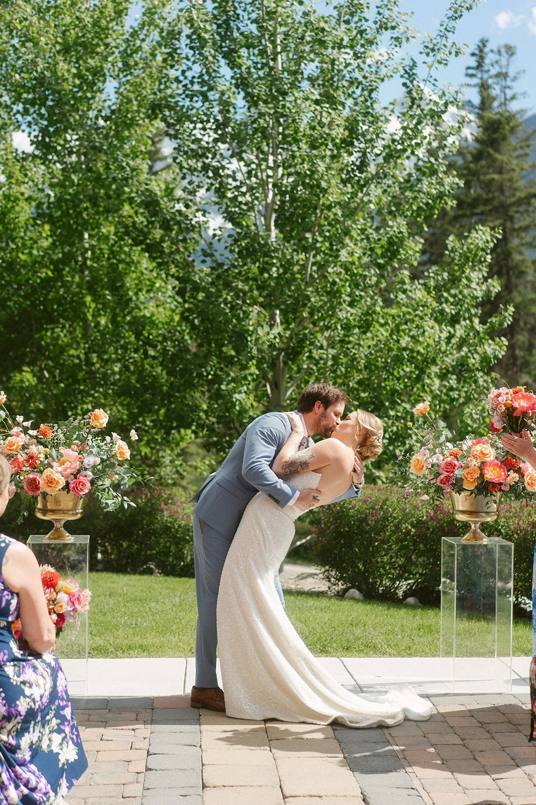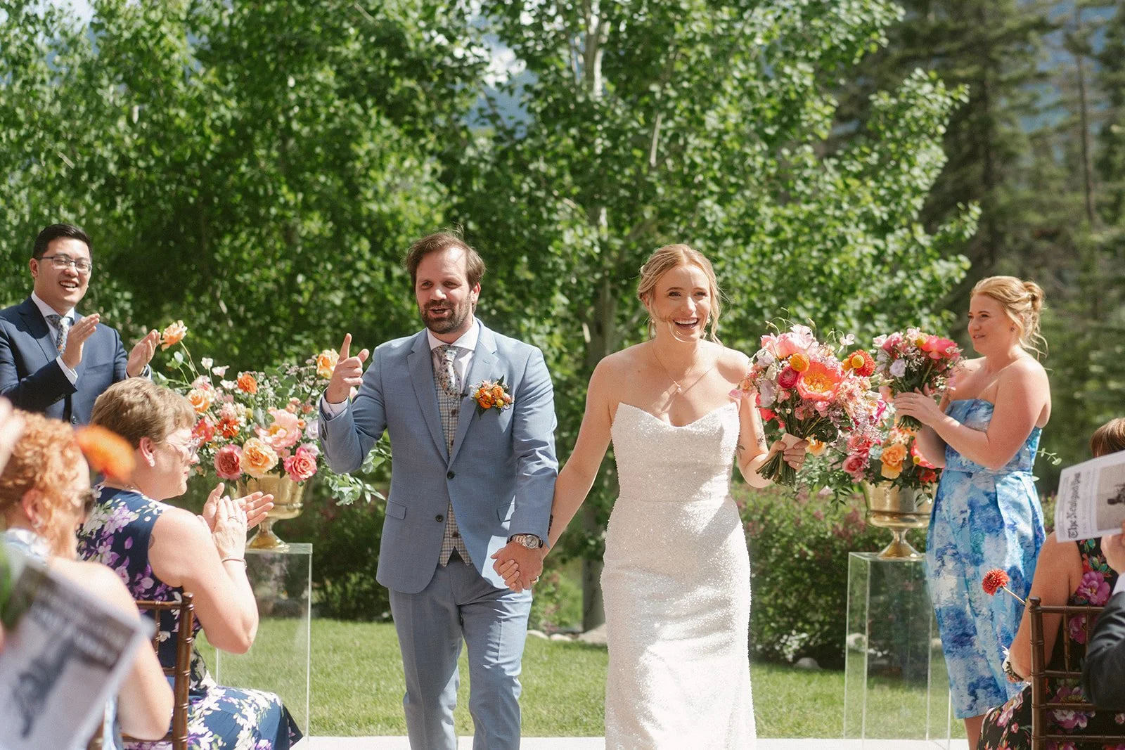 Their ceremony unfolded beneath open skies, framed by panoramic views of the Rockies, including the iconic Three Sisters. Lush, playful florals by Willow Flower Co. introduced soft pinks, greens, and warm citrus tones that popped against the alpine landscape, while guests were welcomed with a thoughtful and creative touch: a custom “Newlywed Post” newspaper that set the tone for a celebration rooted in personality and intention. And then came the vows.