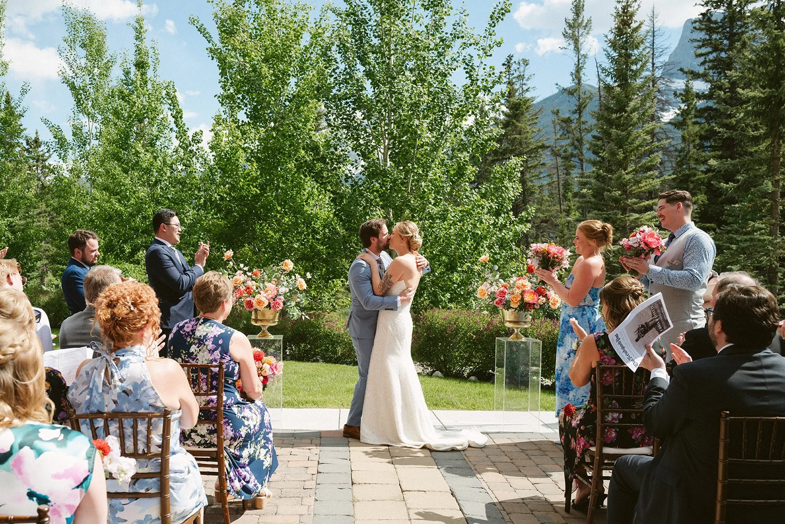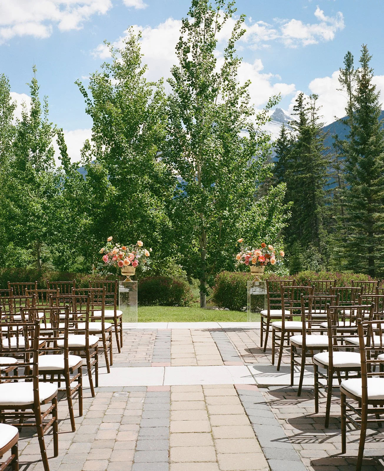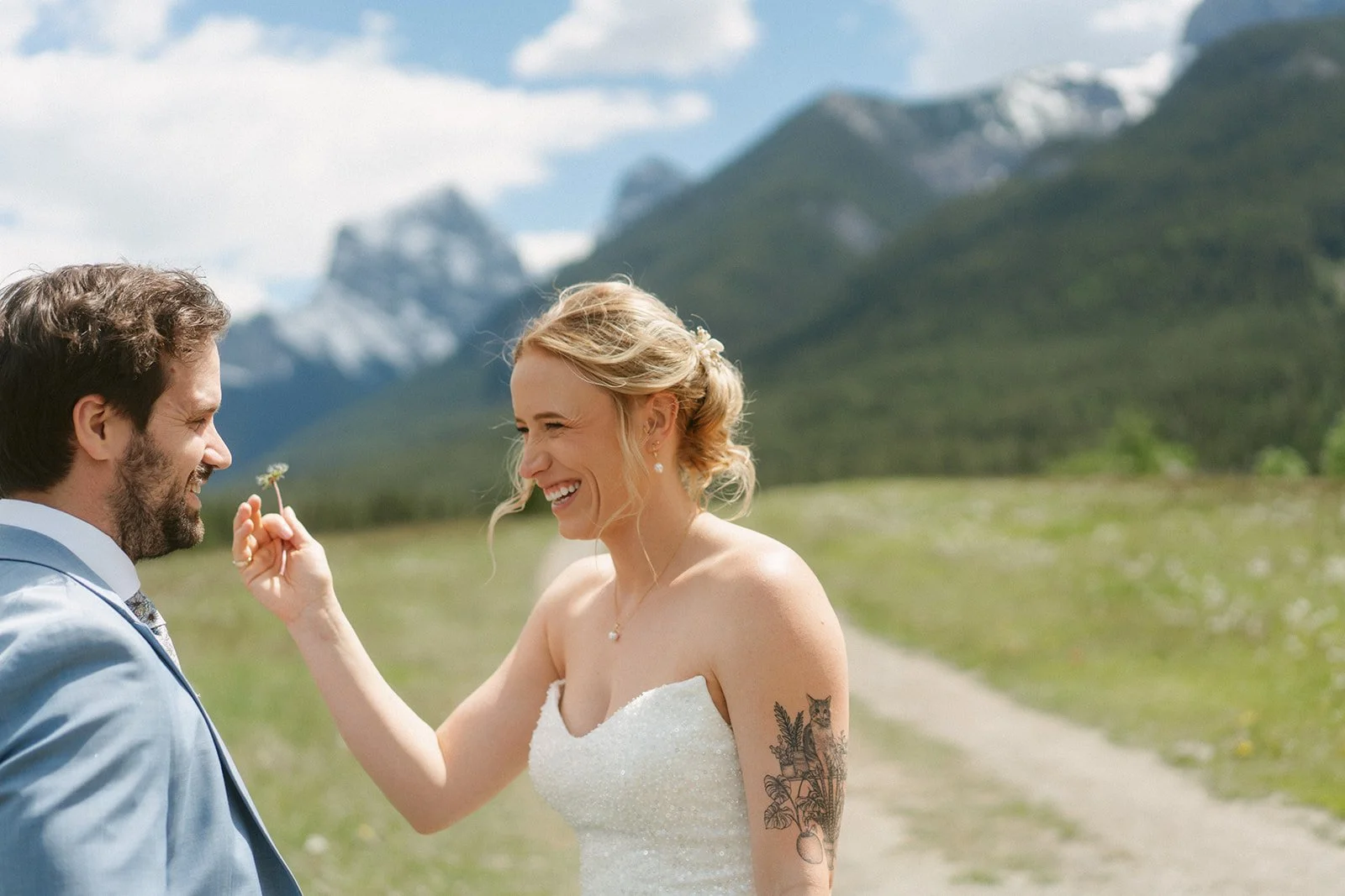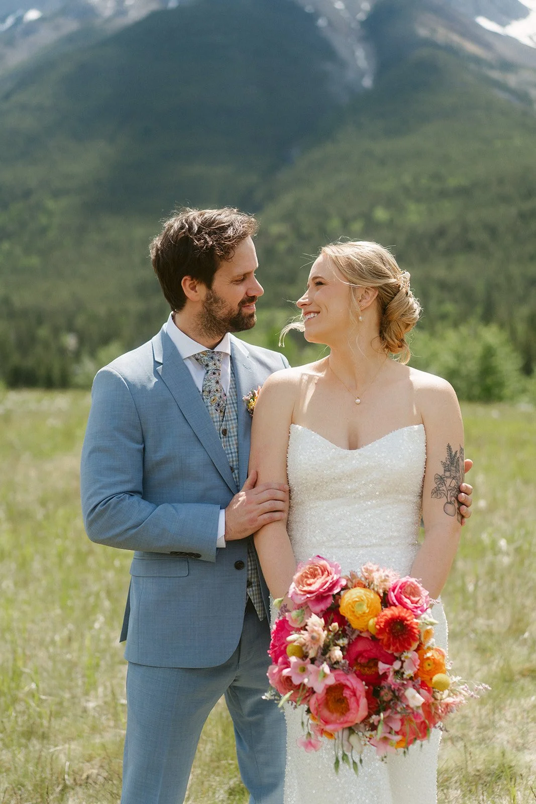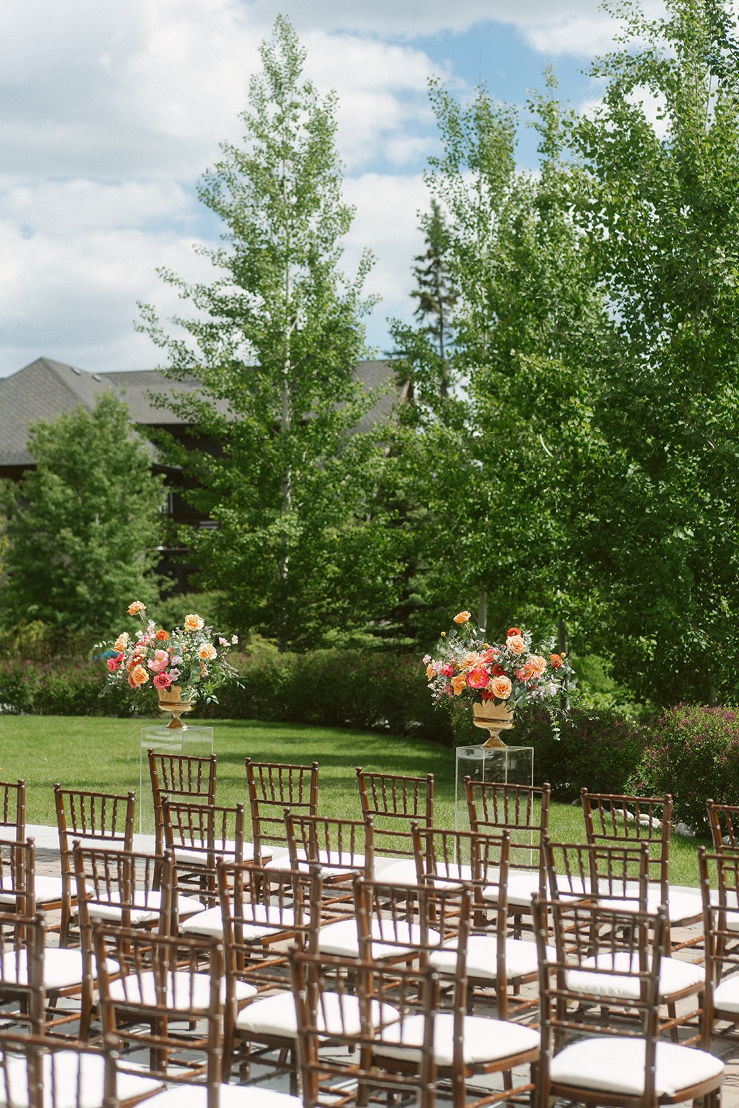 Their ceremony unfolded beneath open skies, framed by panoramic views of the Rockies, including the iconic Three Sisters. Lush, playful florals by Willow Flower Co. introduced soft pinks, greens, and warm citrus tones that popped against the alpine landscape, while guests were welcomed with a thoughtful and creative touch: a custom “Newlywed Post” newspaper that set the tone for a celebration rooted in personality and intention. And then came the vows.