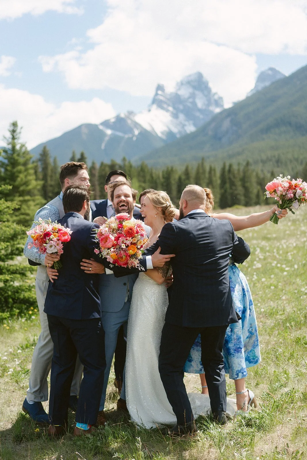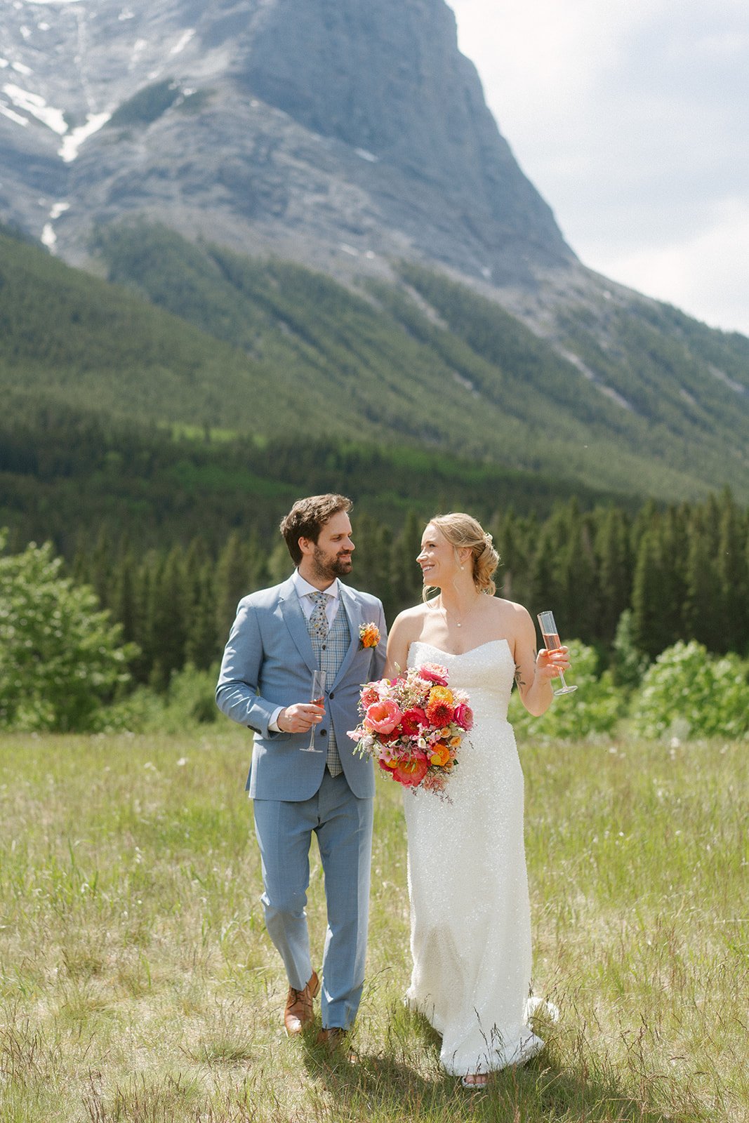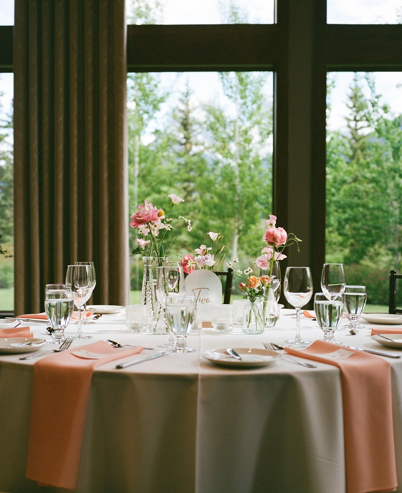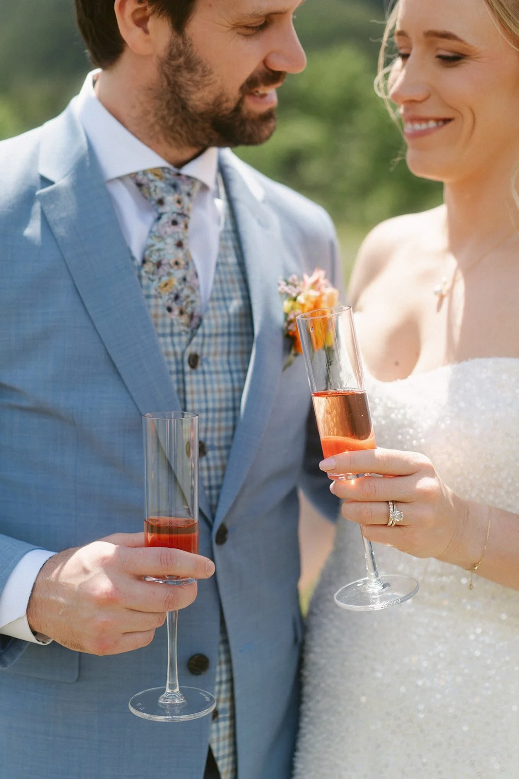 Their ceremony unfolded beneath open skies, framed by panoramic views of the Rockies, including the iconic Three Sisters. Lush, playful florals by Willow Flower Co. introduced soft pinks, greens, and warm citrus tones that popped against the alpine landscape, while guests were welcomed with a thoughtful and creative touch: a custom “Newlywed Post” newspaper that set the tone for a celebration rooted in personality and intention. And then came the vows.