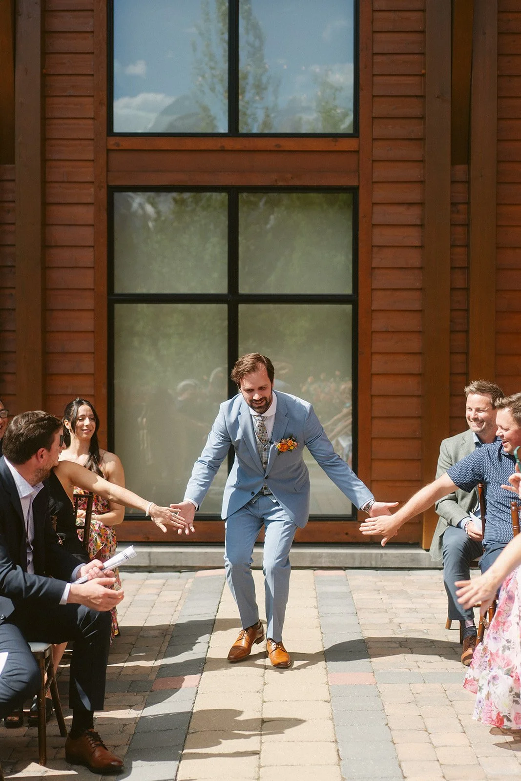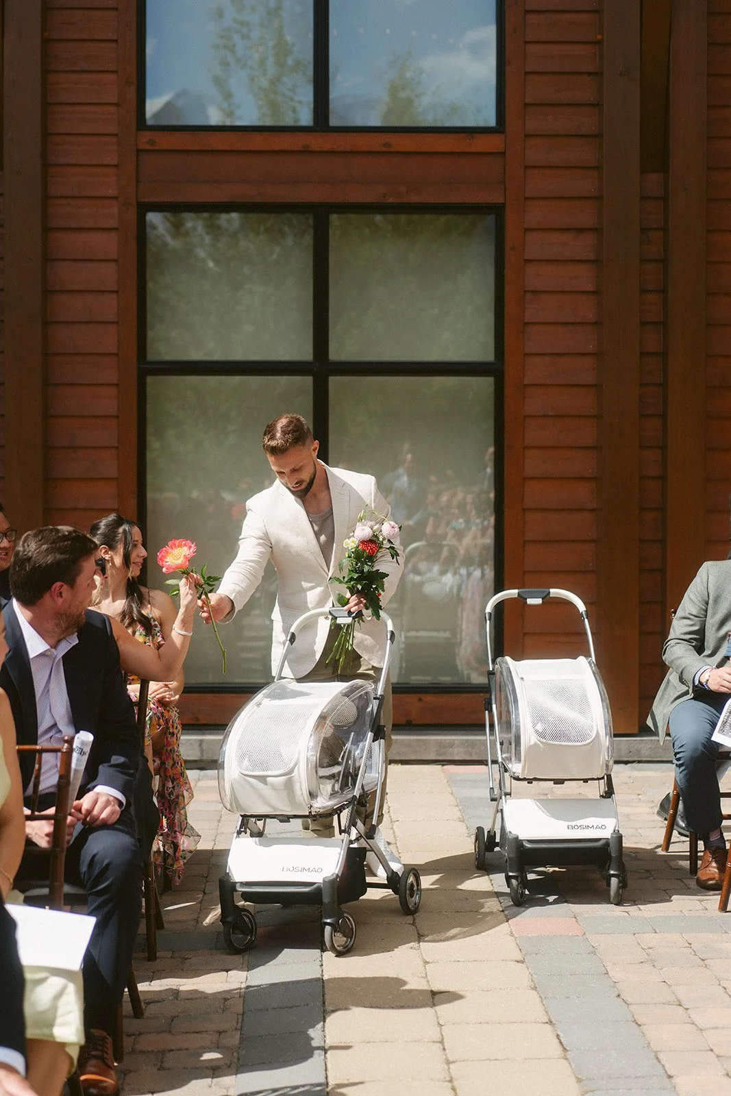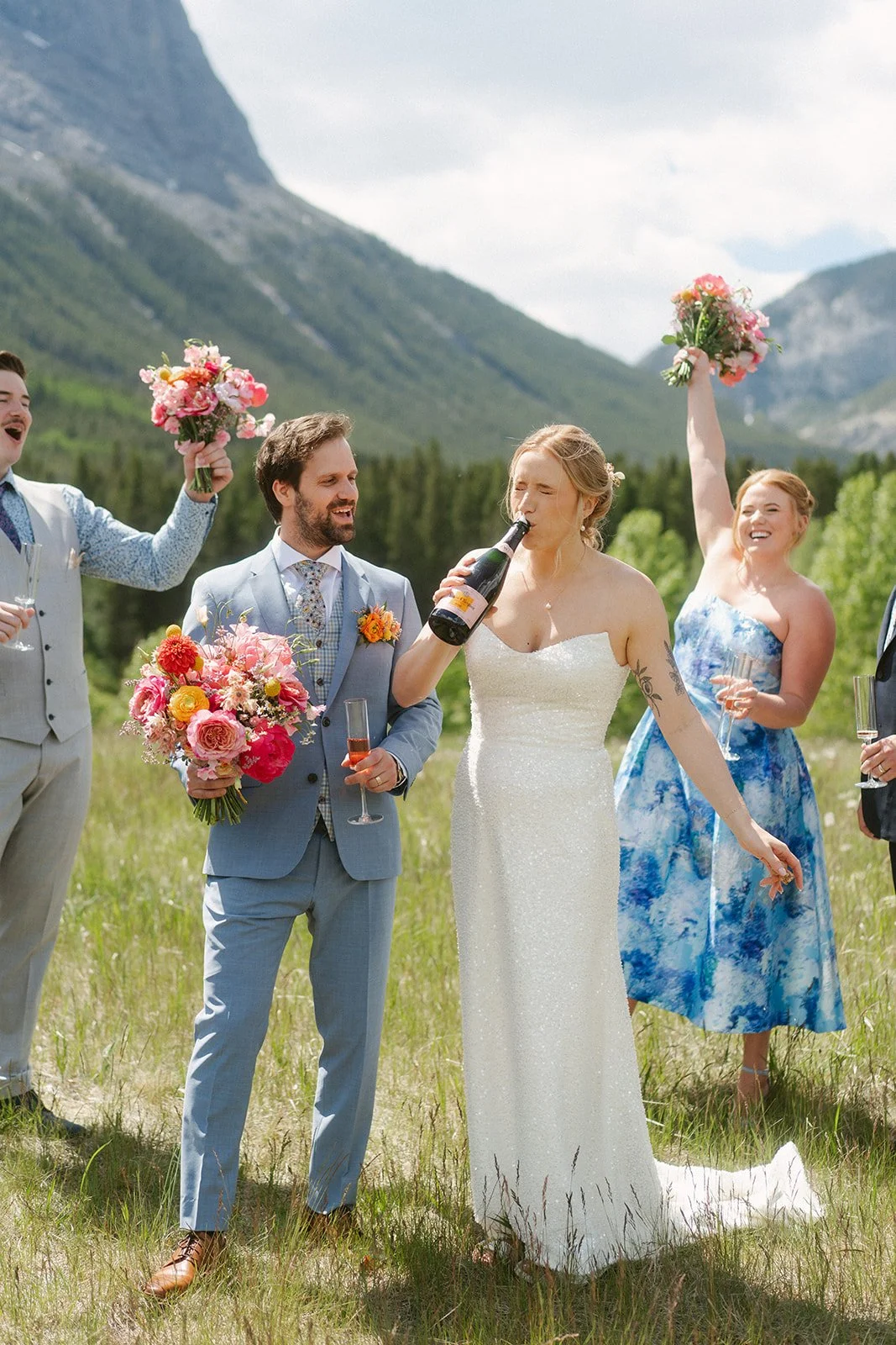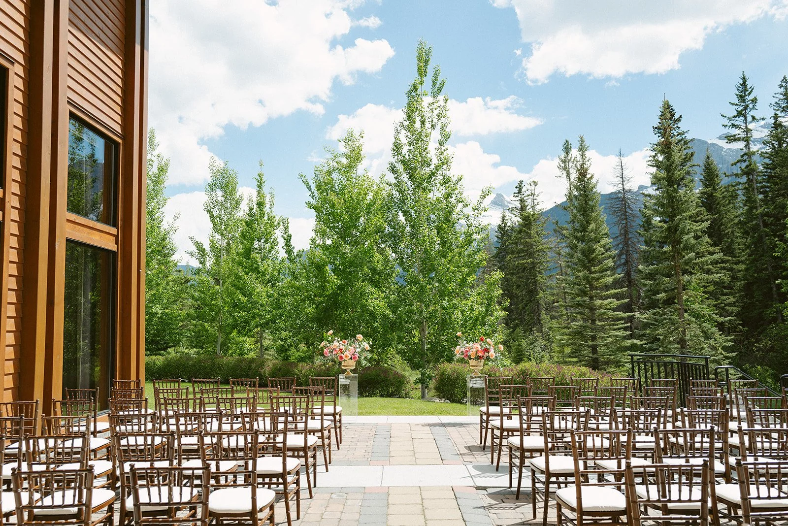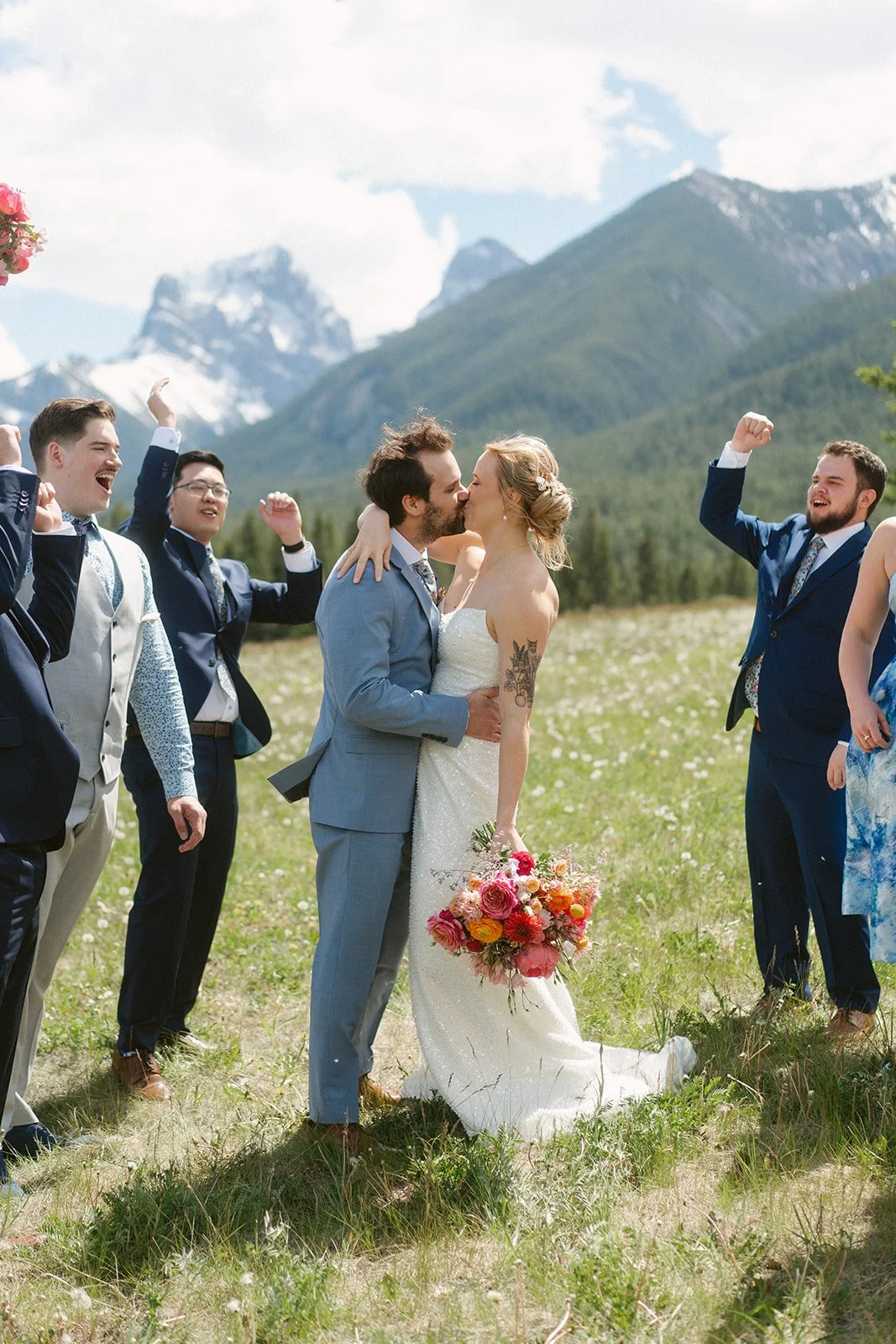 Their ceremony unfolded beneath open skies, framed by panoramic views of the Rockies, including the iconic Three Sisters. Lush, playful florals by Willow Flower Co. introduced soft pinks, greens, and warm citrus tones that popped against the alpine landscape, while guests were welcomed with a thoughtful and creative touch: a custom “Newlywed Post” newspaper that set the tone for a celebration rooted in personality and intention. And then came the vows.