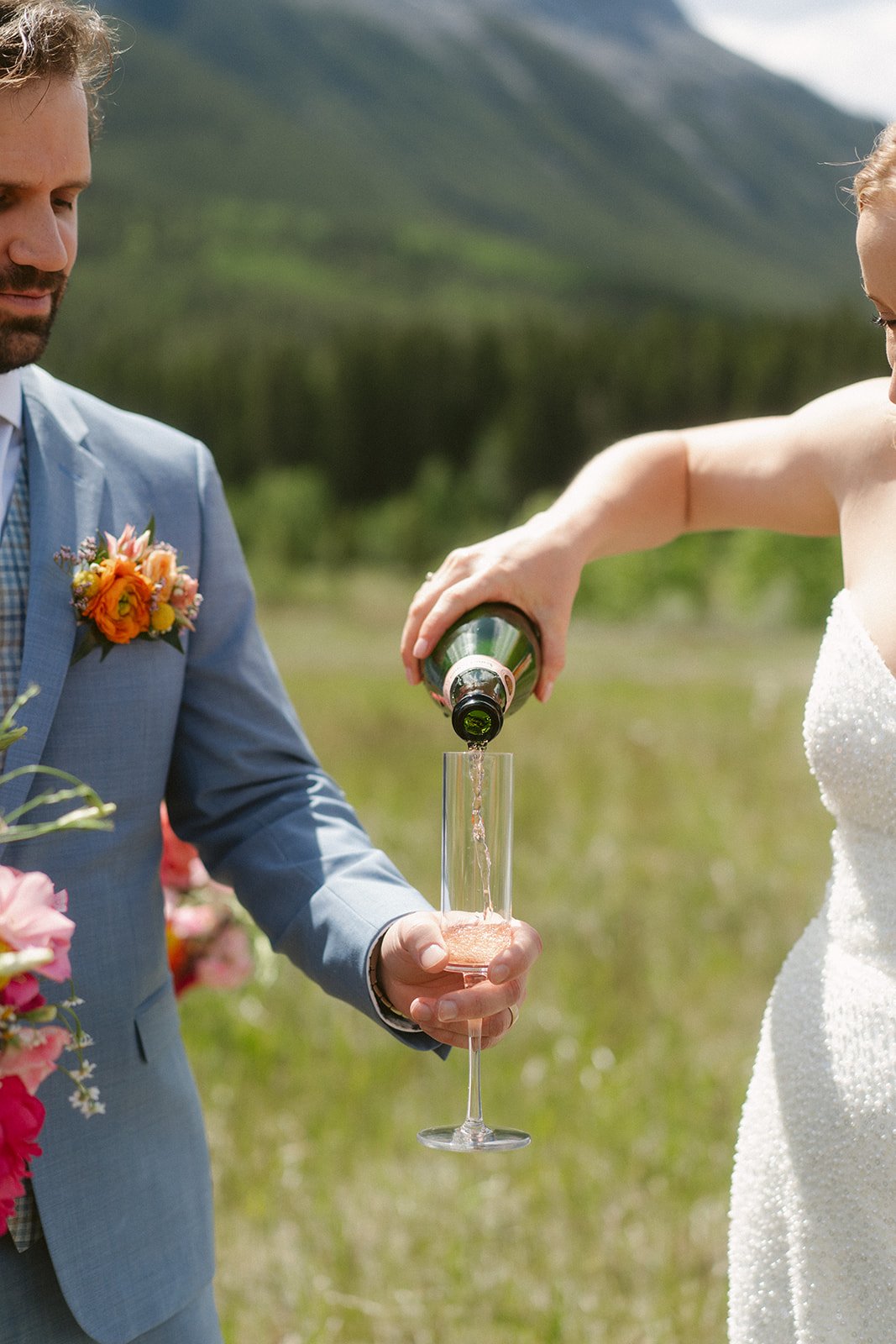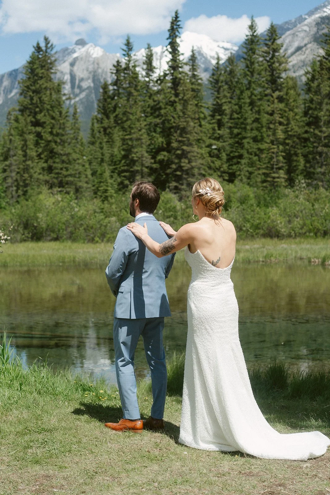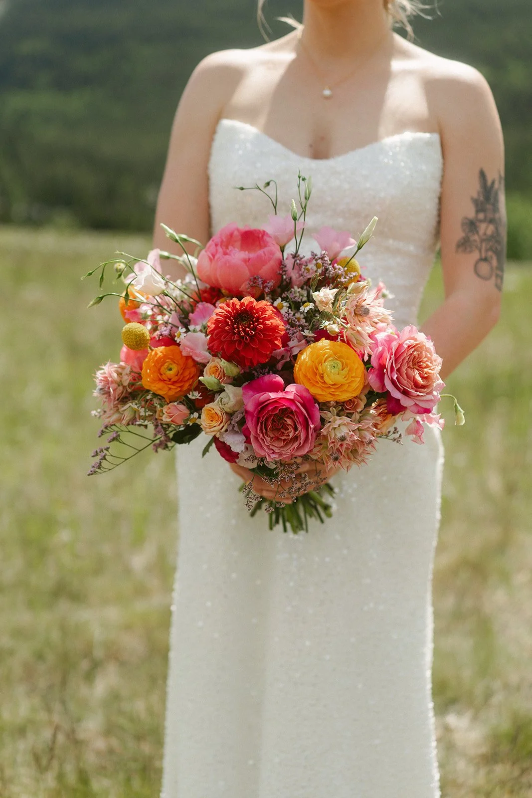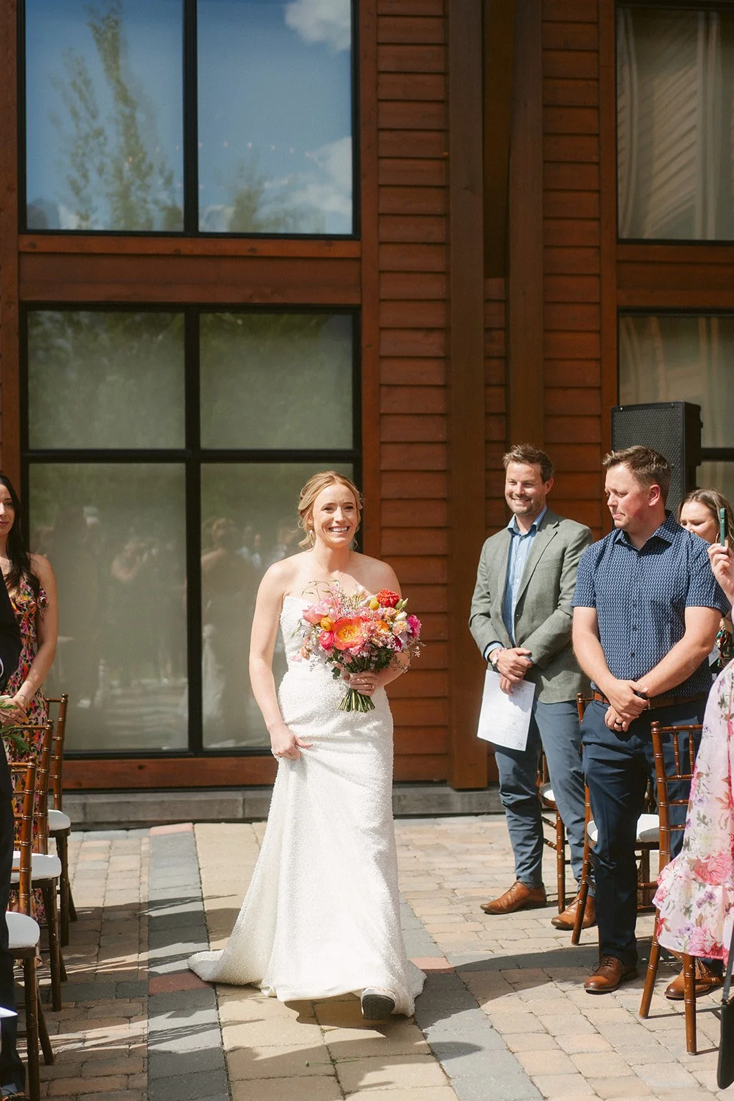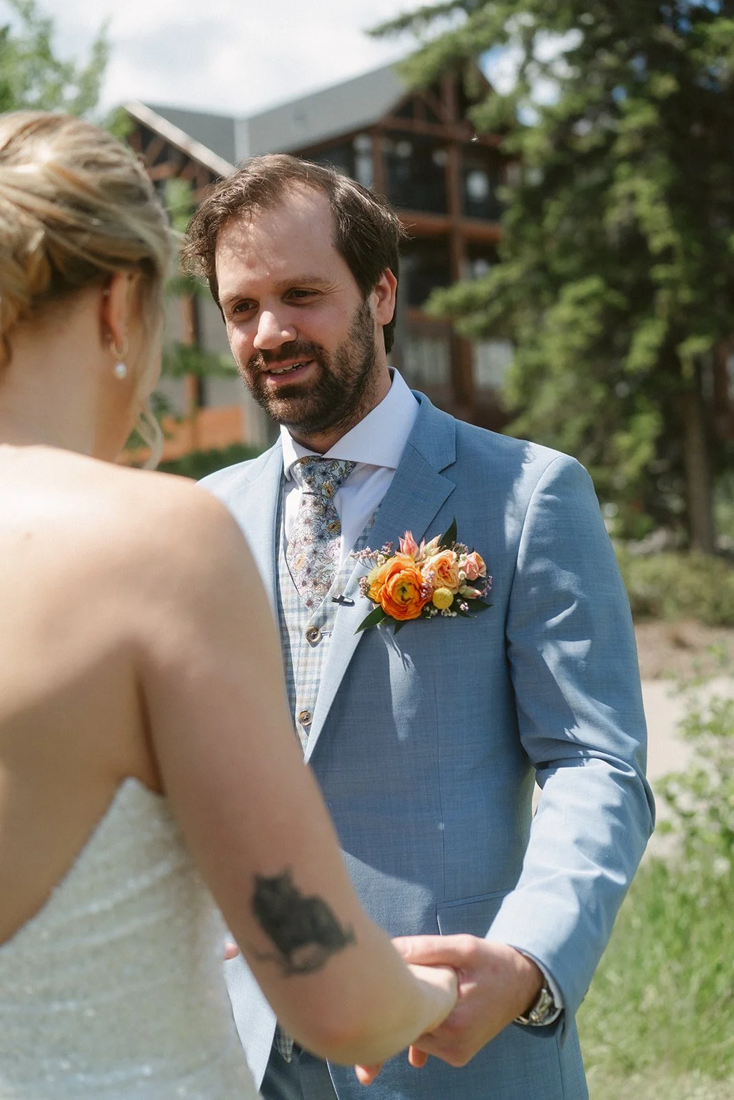 Their ceremony unfolded beneath open skies, framed by panoramic views of the Rockies, including the iconic Three Sisters. Lush, playful florals by Willow Flower Co. introduced soft pinks, greens, and warm citrus tones that popped against the alpine landscape, while guests were welcomed with a thoughtful and creative touch: a custom “Newlywed Post” newspaper that set the tone for a celebration rooted in personality and intention. And then came the vows.