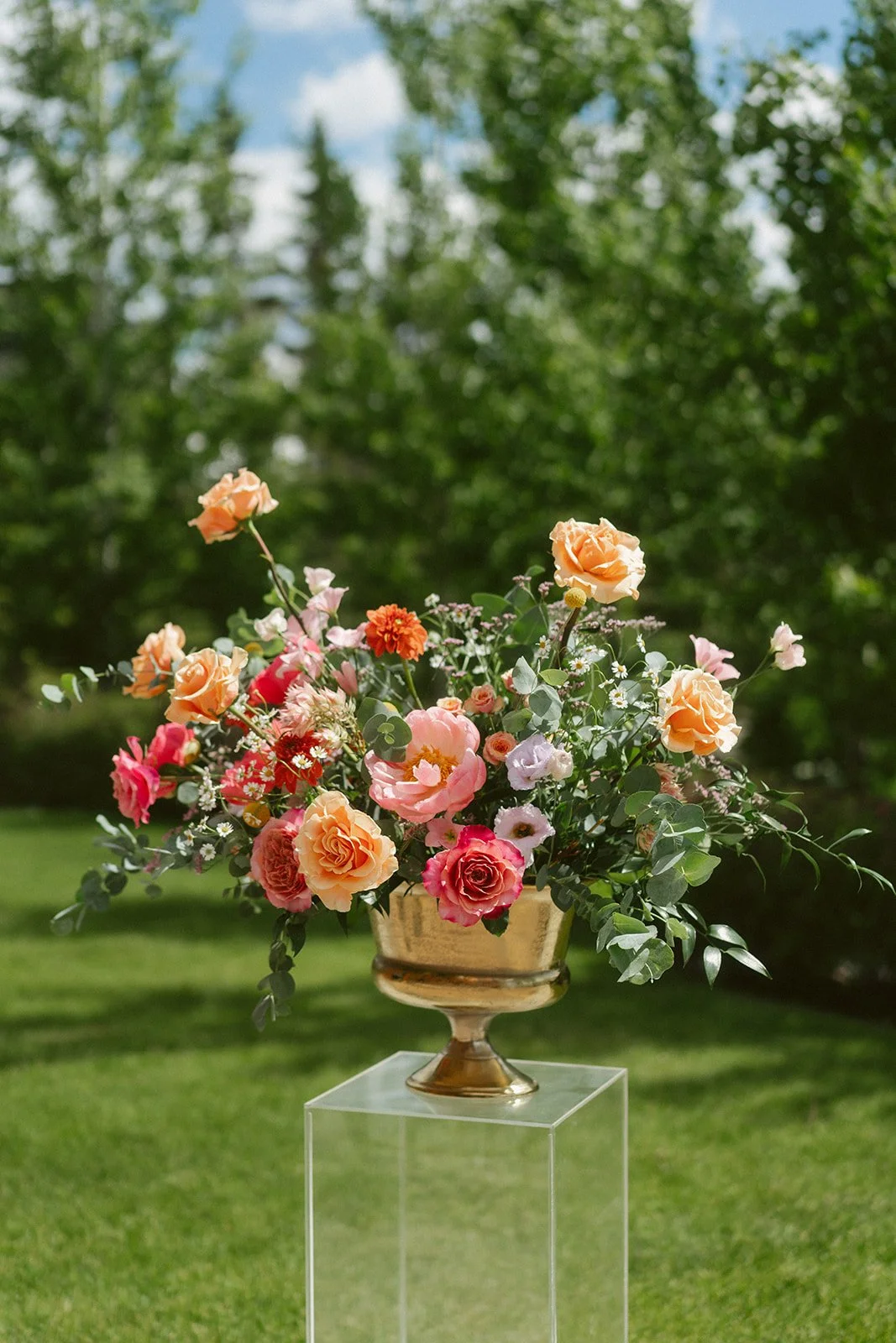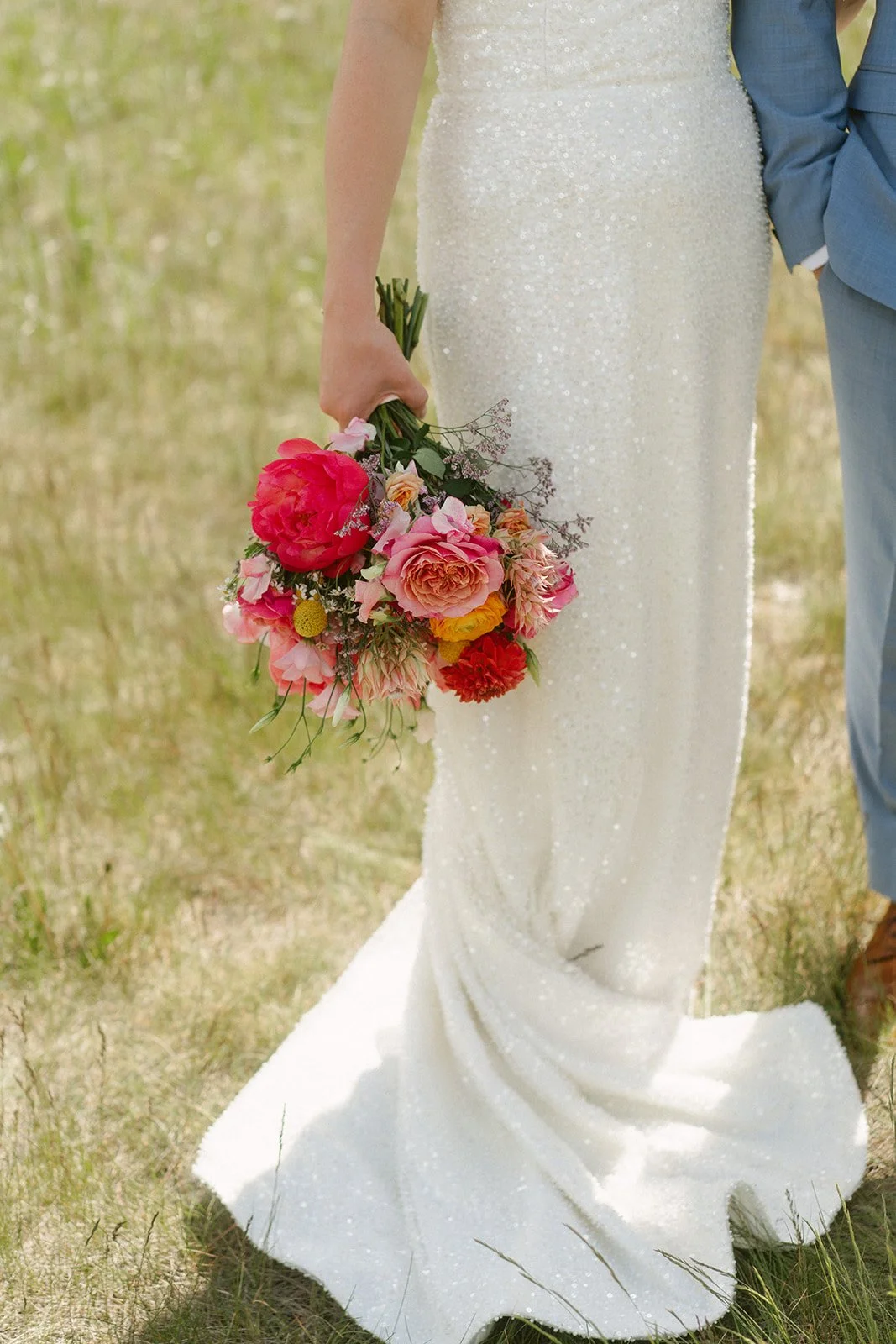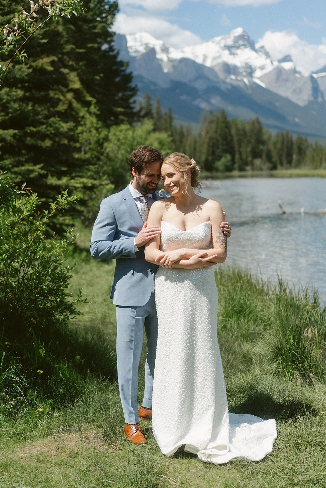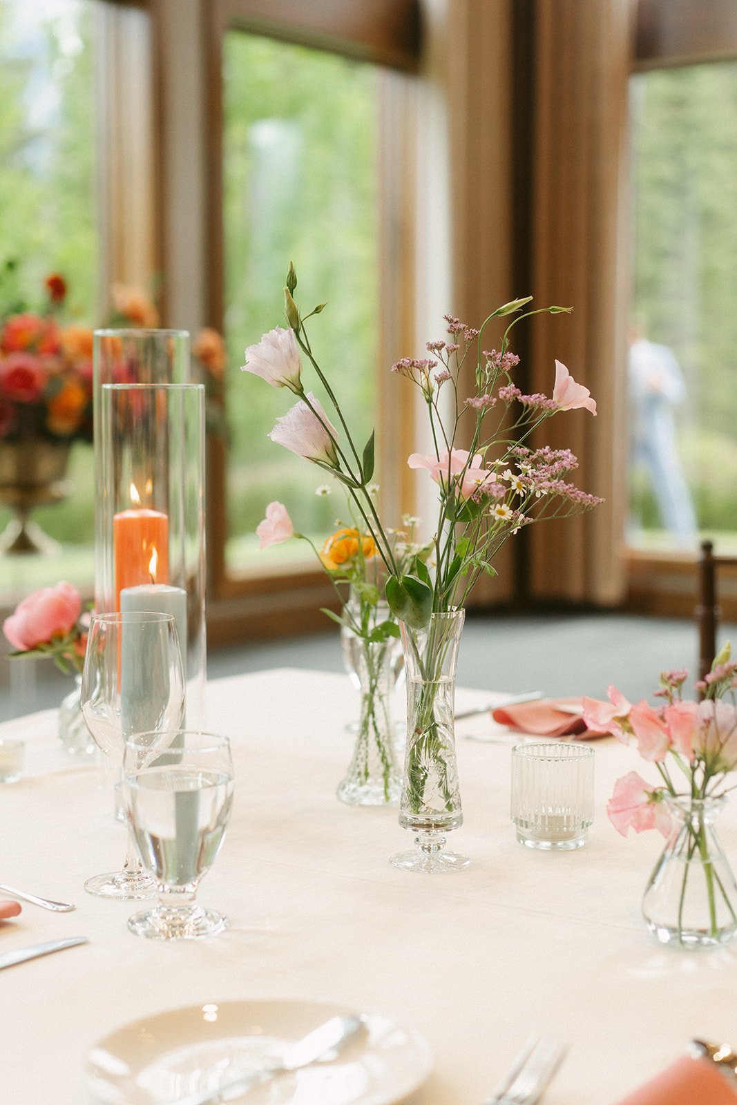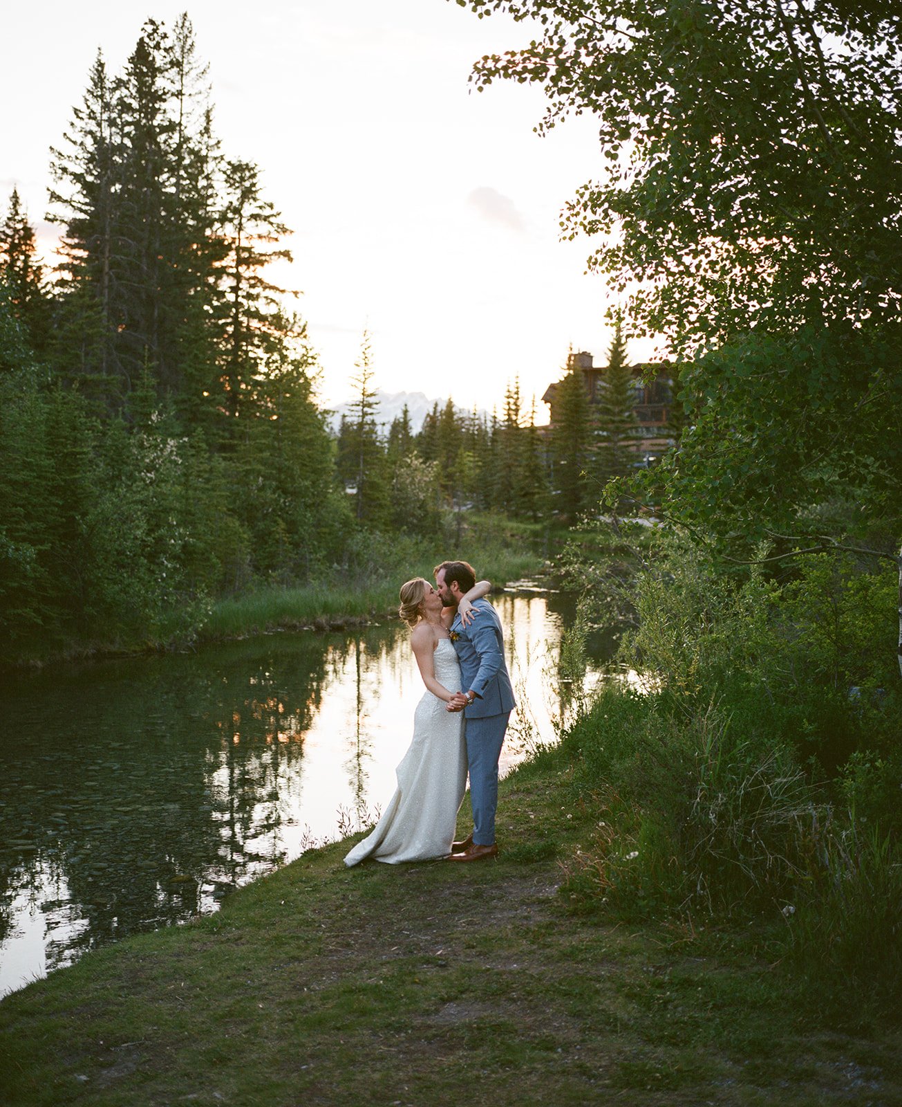 Their ceremony unfolded beneath open skies, framed by panoramic views of the Rockies, including the iconic Three Sisters. Lush, playful florals by Willow Flower Co. introduced soft pinks, greens, and warm citrus tones that popped against the alpine landscape, while guests were welcomed with a thoughtful and creative touch: a custom “Newlywed Post” newspaper that set the tone for a celebration rooted in personality and intention. And then came the vows.