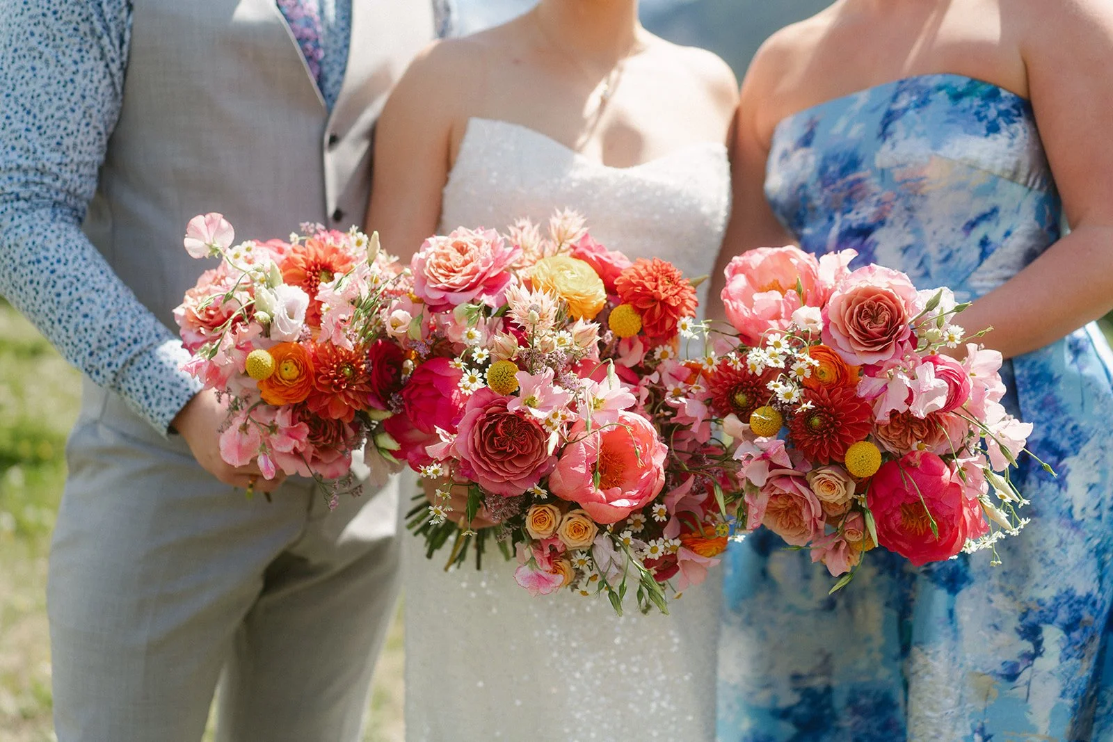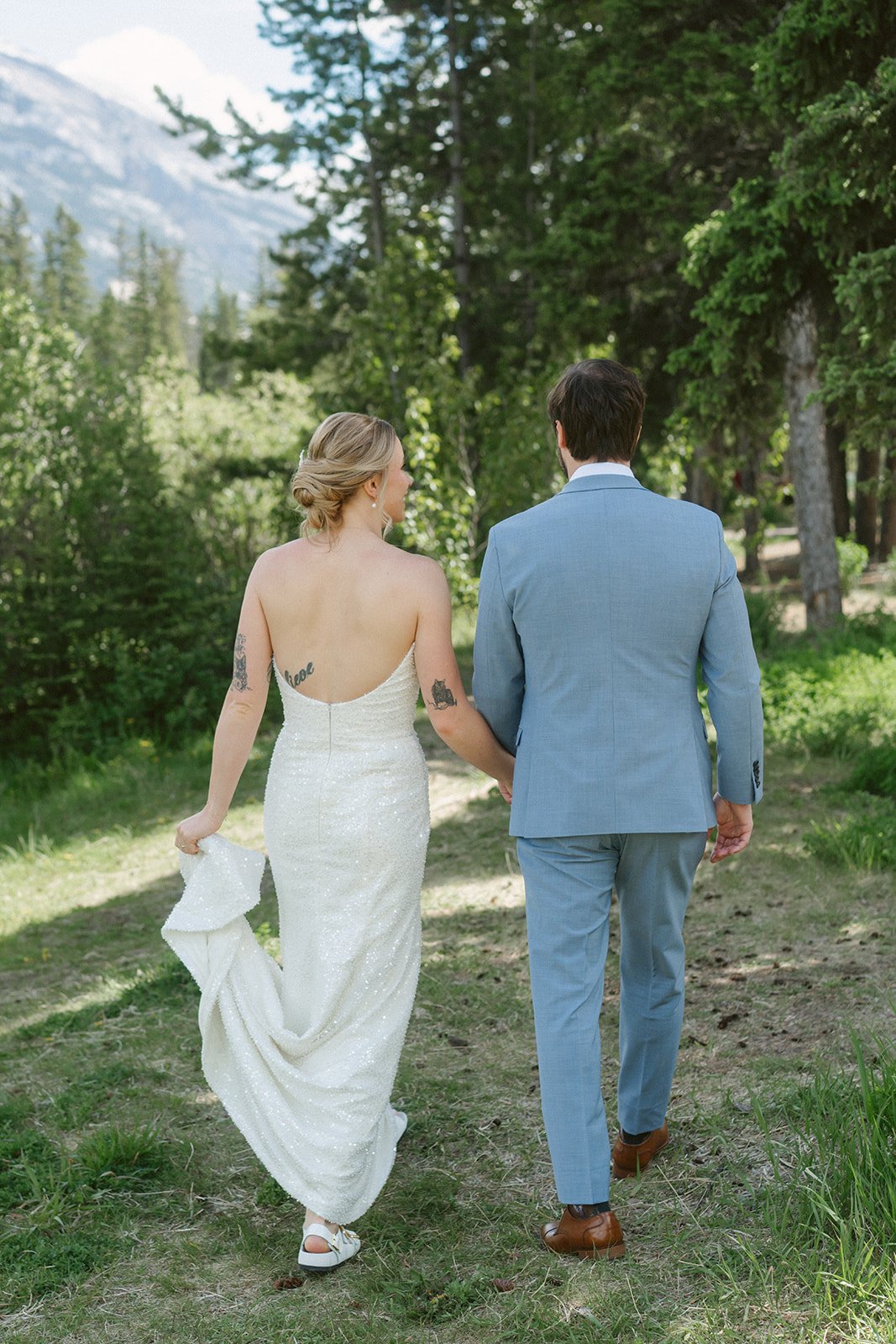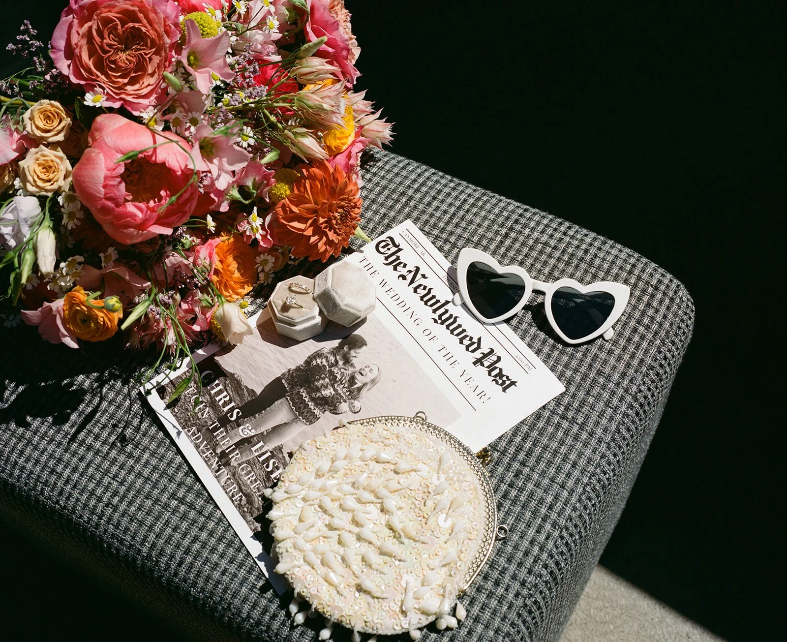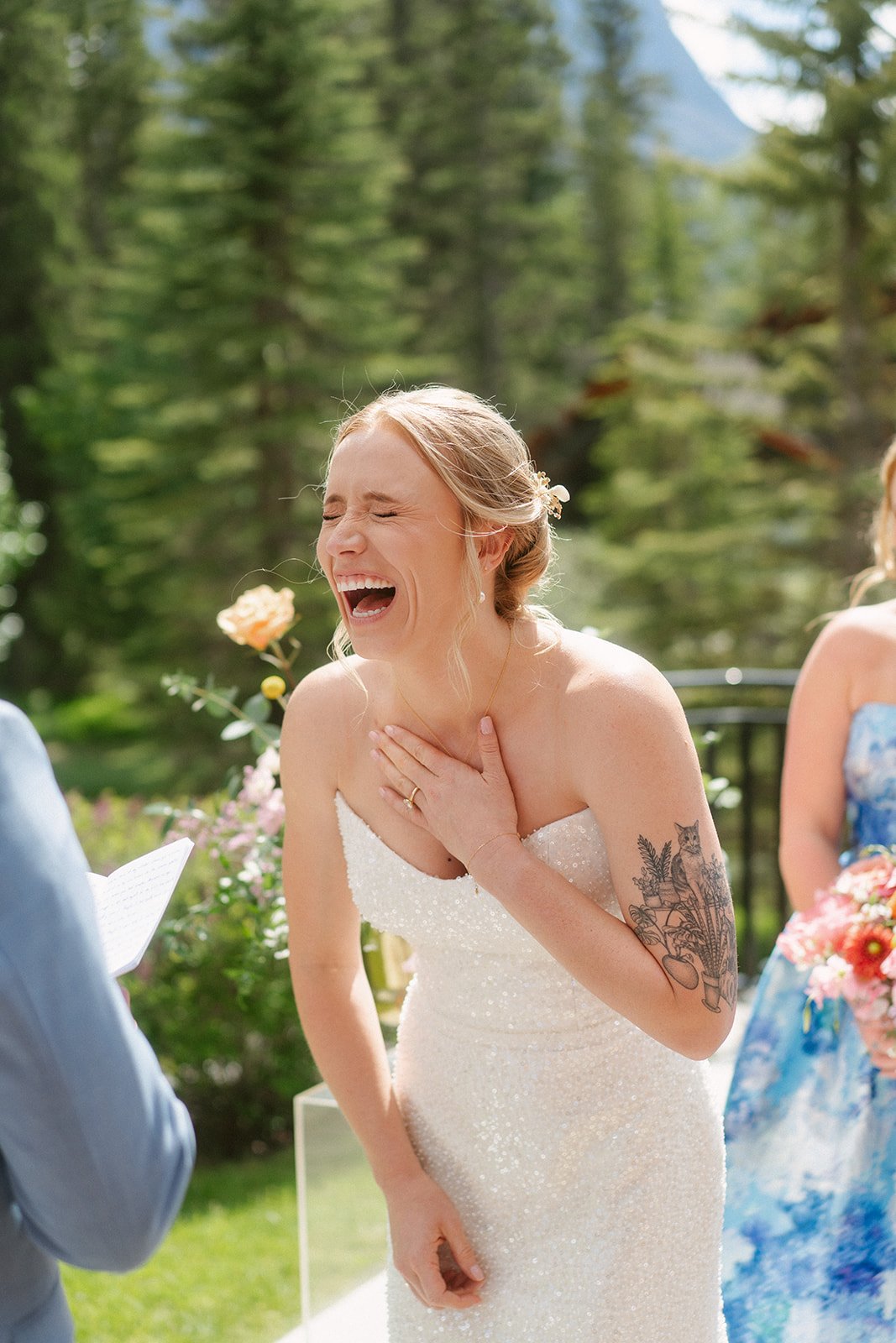 Their ceremony unfolded beneath open skies, framed by panoramic views of the Rockies, including the iconic Three Sisters. Lush, playful florals by Willow Flower Co. introduced soft pinks, greens, and warm citrus tones that popped against the alpine landscape, while guests were welcomed with a thoughtful and creative touch: a custom “Newlywed Post” newspaper that set the tone for a celebration rooted in personality and intention. And then came the vows.