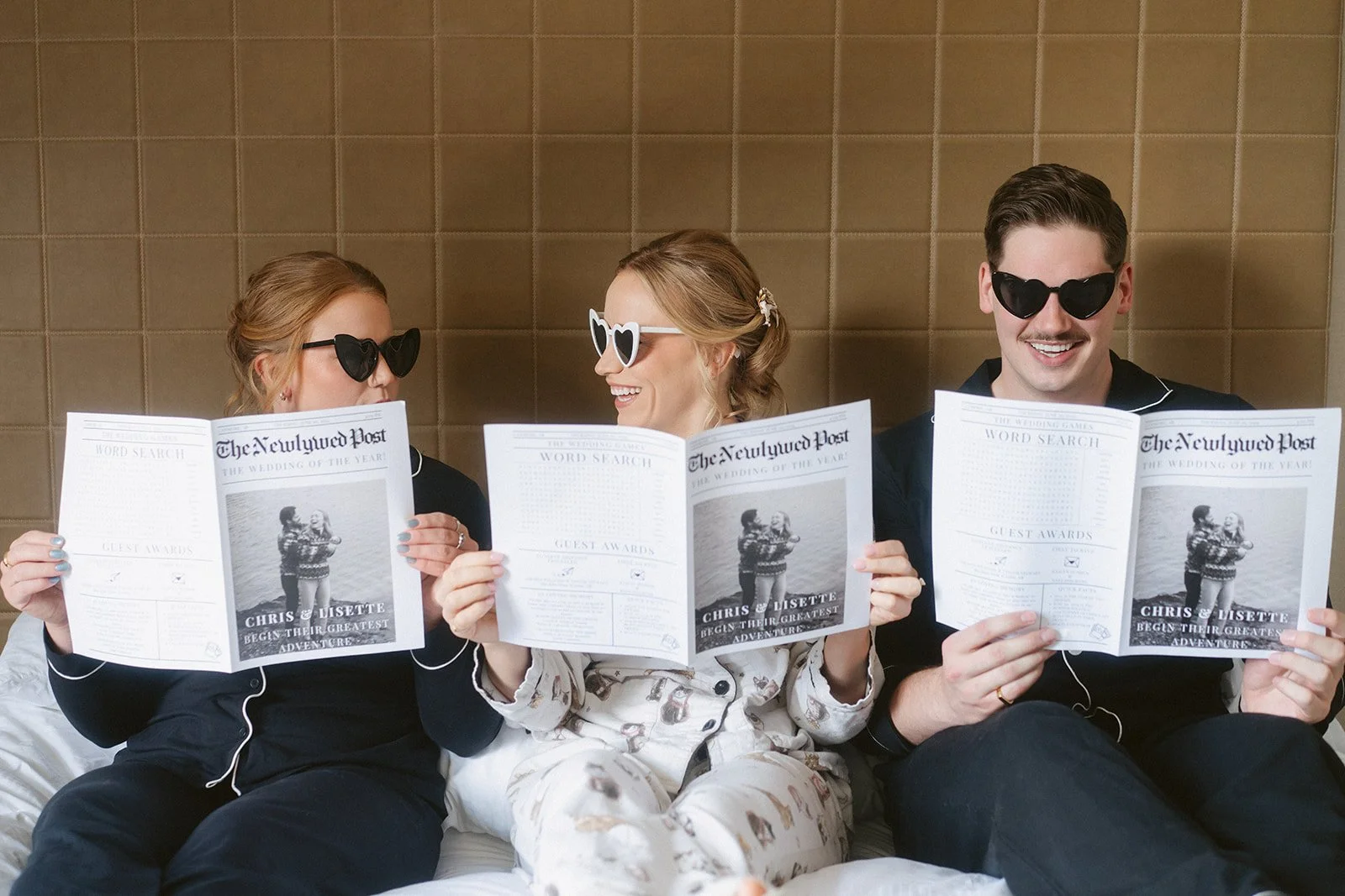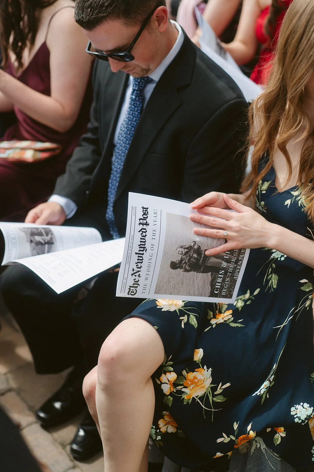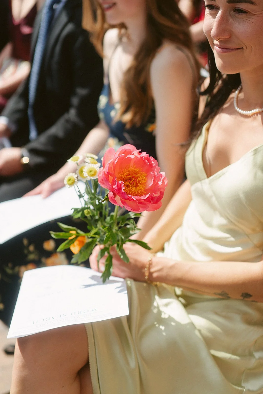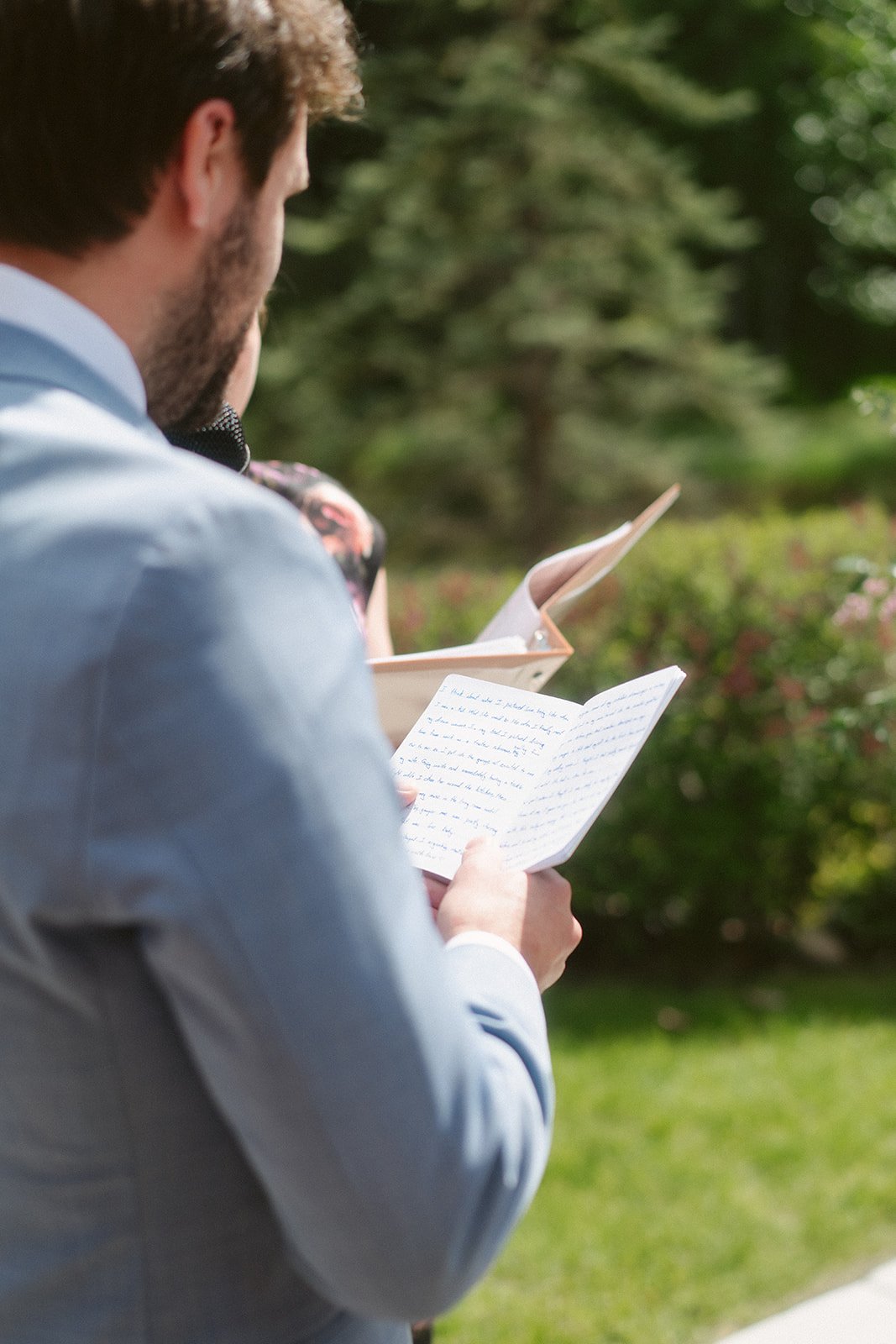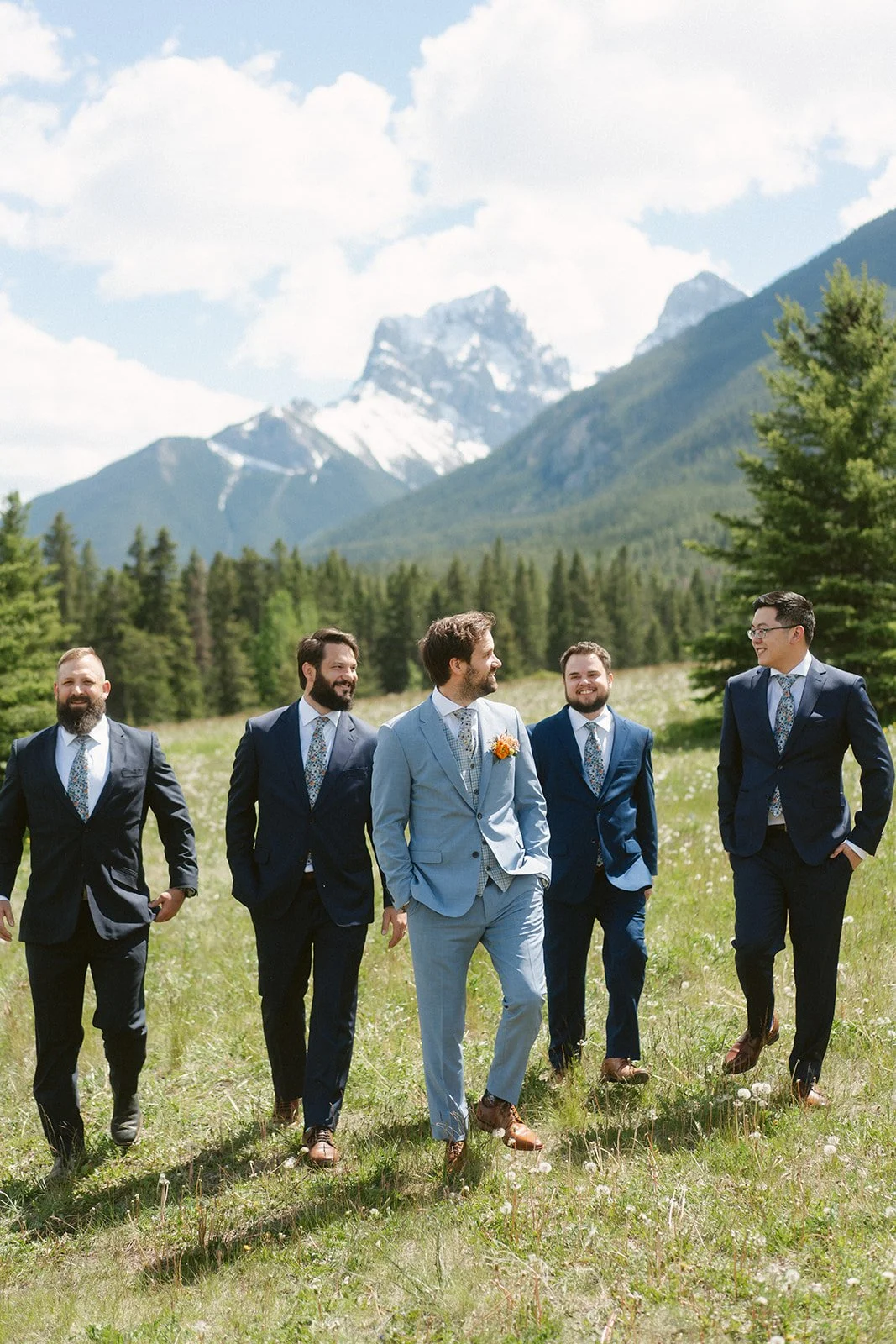 Their ceremony unfolded beneath open skies, framed by panoramic views of the Rockies, including the iconic Three Sisters. Lush, playful florals by Willow Flower Co. introduced soft pinks, greens, and warm citrus tones that popped against the alpine landscape, while guests were welcomed with a thoughtful and creative touch: a custom “Newlywed Post” newspaper that set the tone for a celebration rooted in personality and intention. And then came the vows.