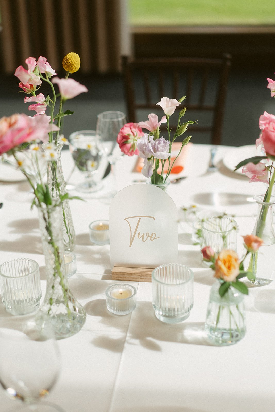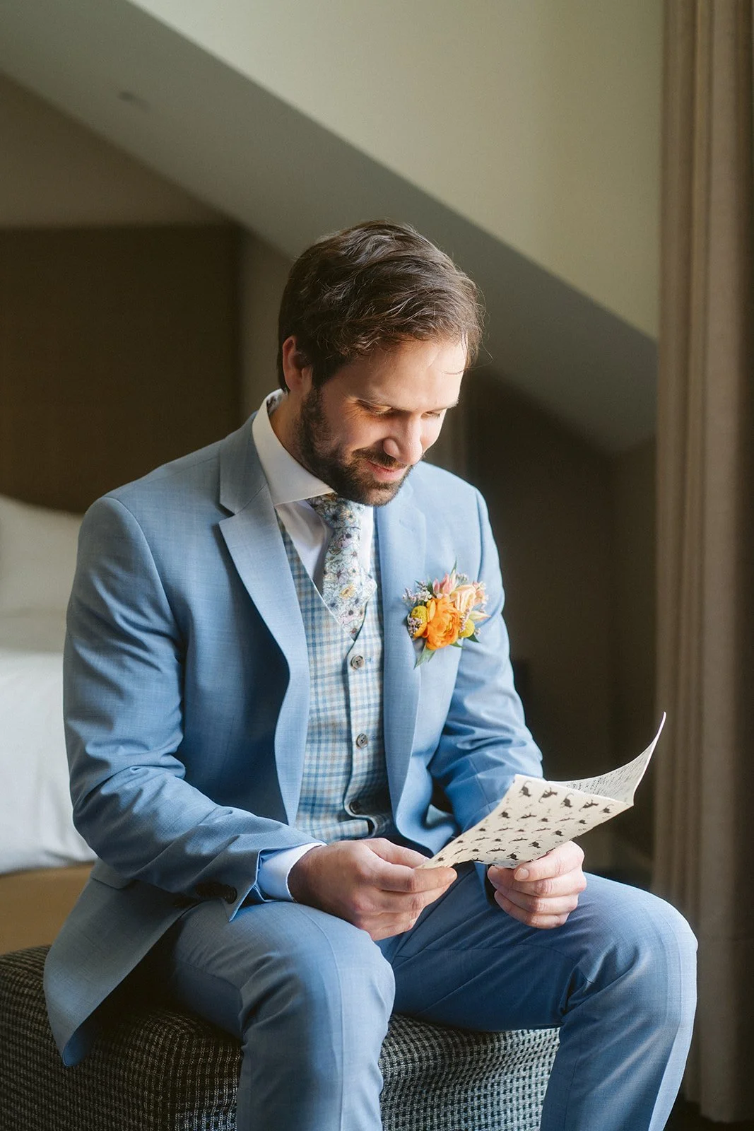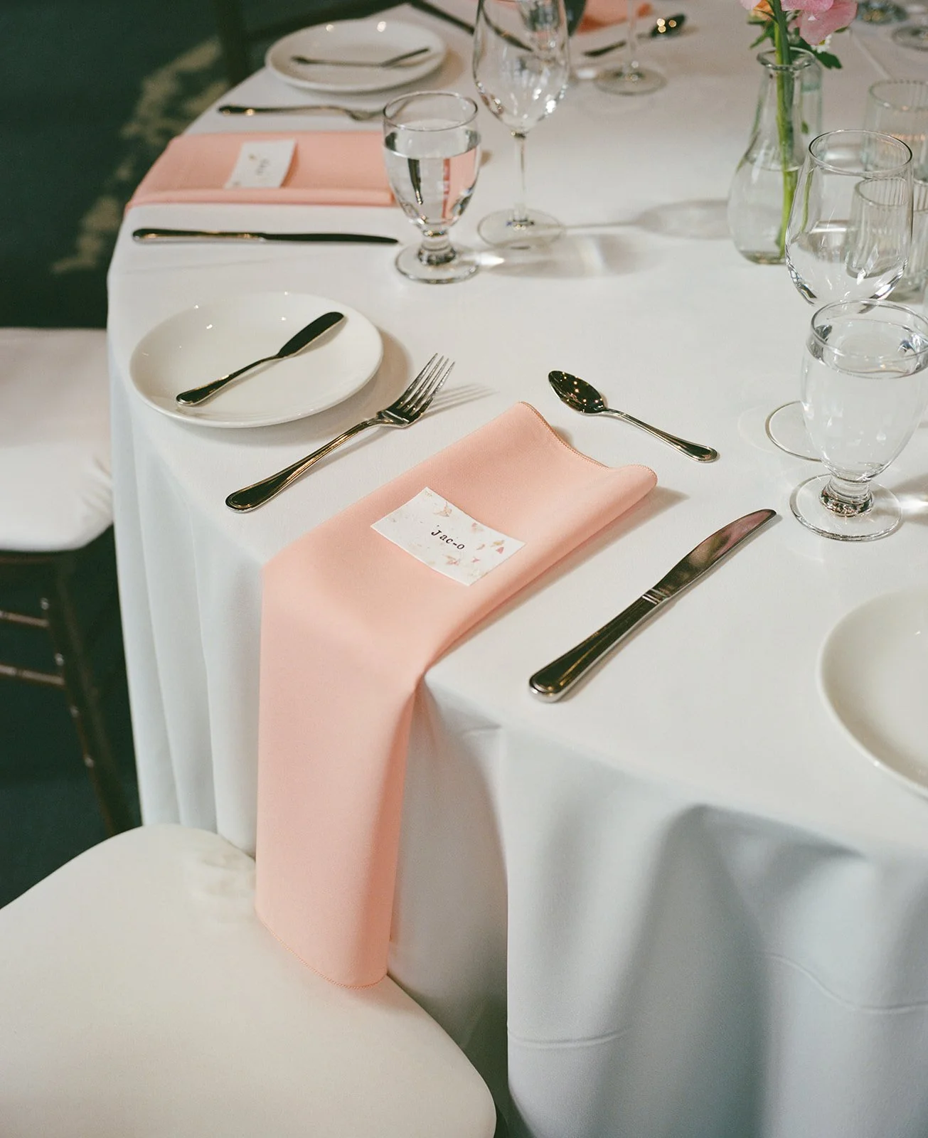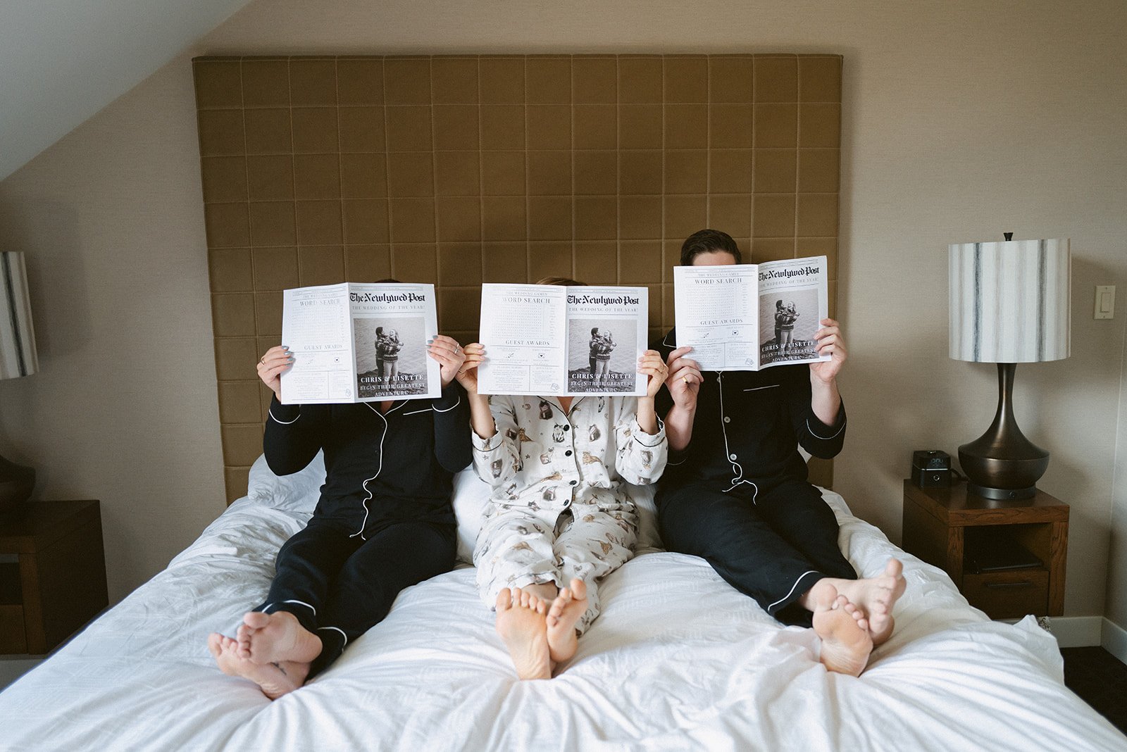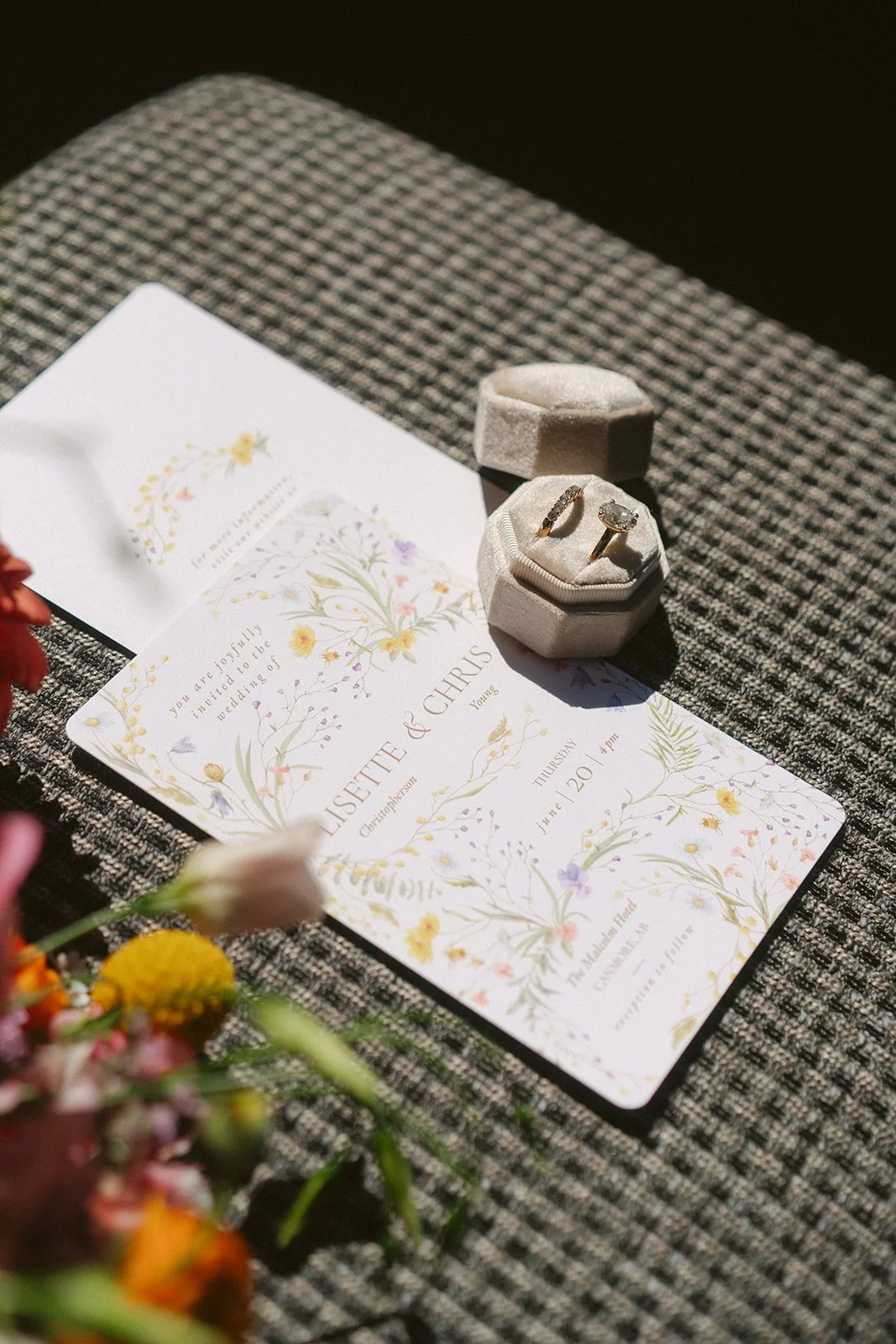 Their ceremony unfolded beneath open skies, framed by panoramic views of the Rockies, including the iconic Three Sisters. Lush, playful florals by Willow Flower Co. introduced soft pinks, greens, and warm citrus tones that popped against the alpine landscape, while guests were welcomed with a thoughtful and creative touch: a custom “Newlywed Post” newspaper that set the tone for a celebration rooted in personality and intention. And then came the vows.
