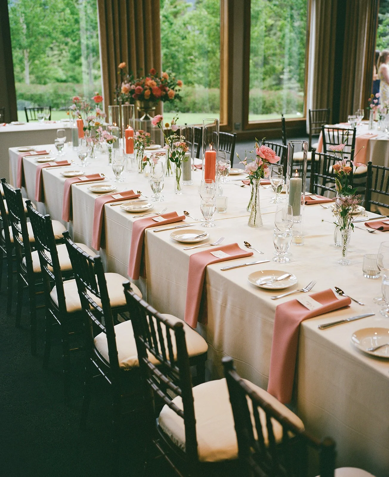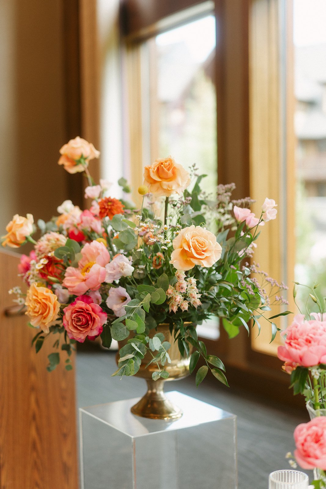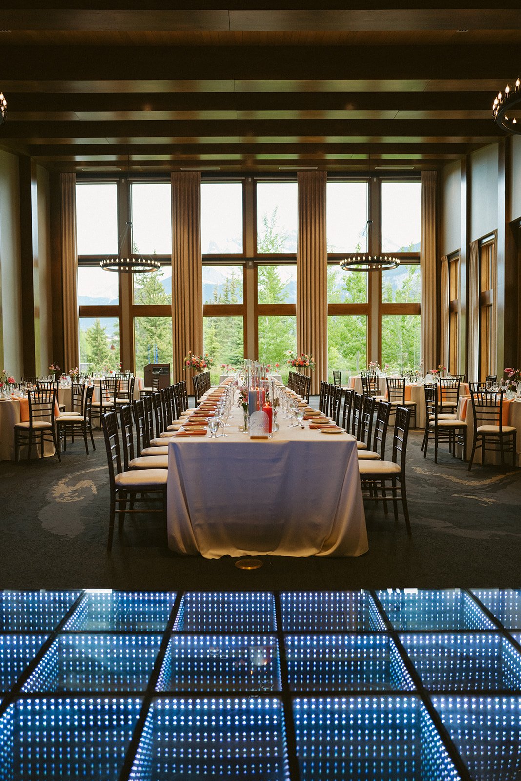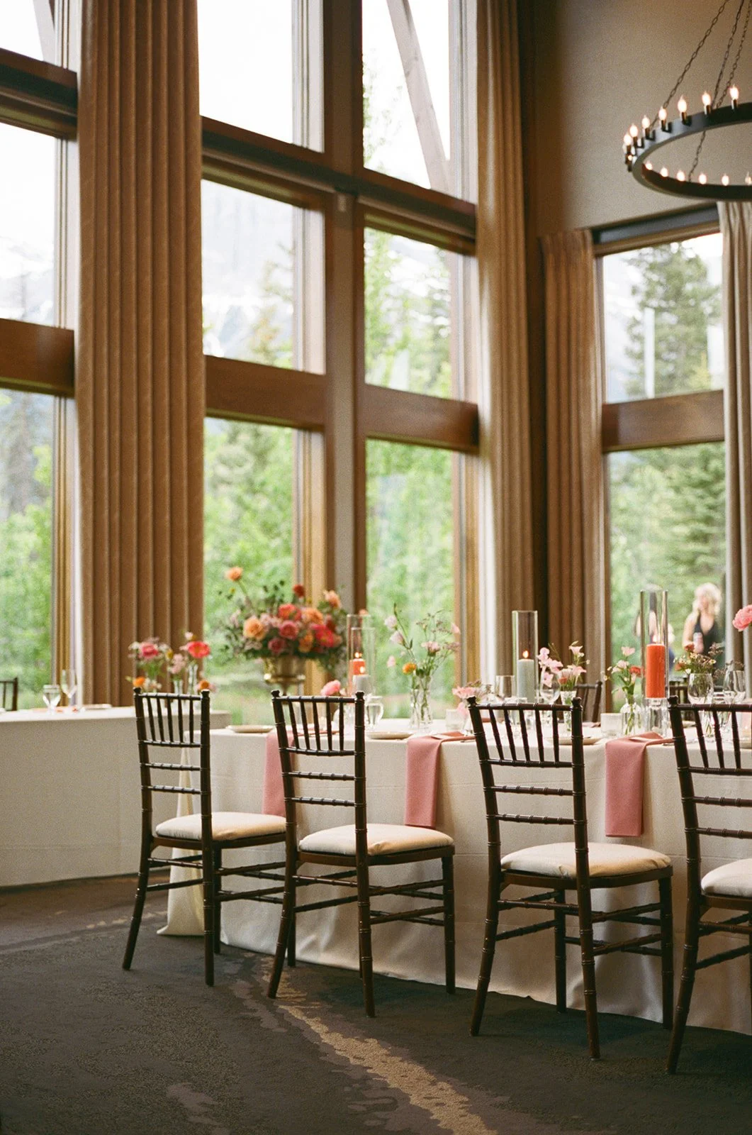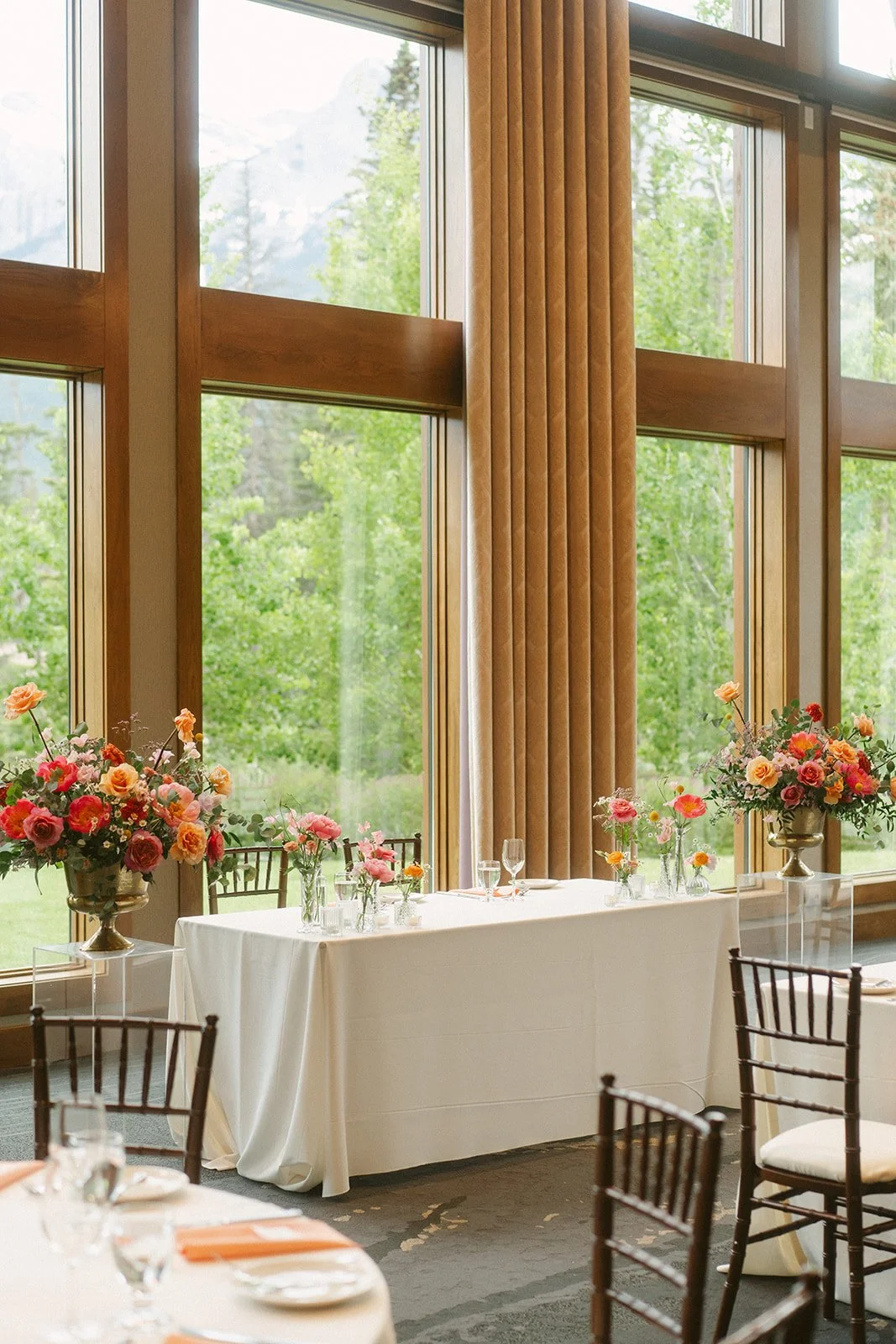 Inside the Malcolm’s stunning ballroom, the celebration transitioned seamlessly into an elevated, light-filled reception. Floor-to-ceiling windows showcased the surrounding peaks, while thoughtfully curated décor and rentals from Mountain Event Rentals layered texture and warmth into the space. The design carried through the vibrant palette from earlier in the day, creating a cohesive atmosphere that felt both elevated and inviting.