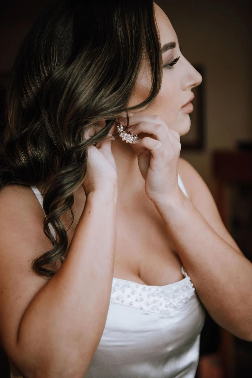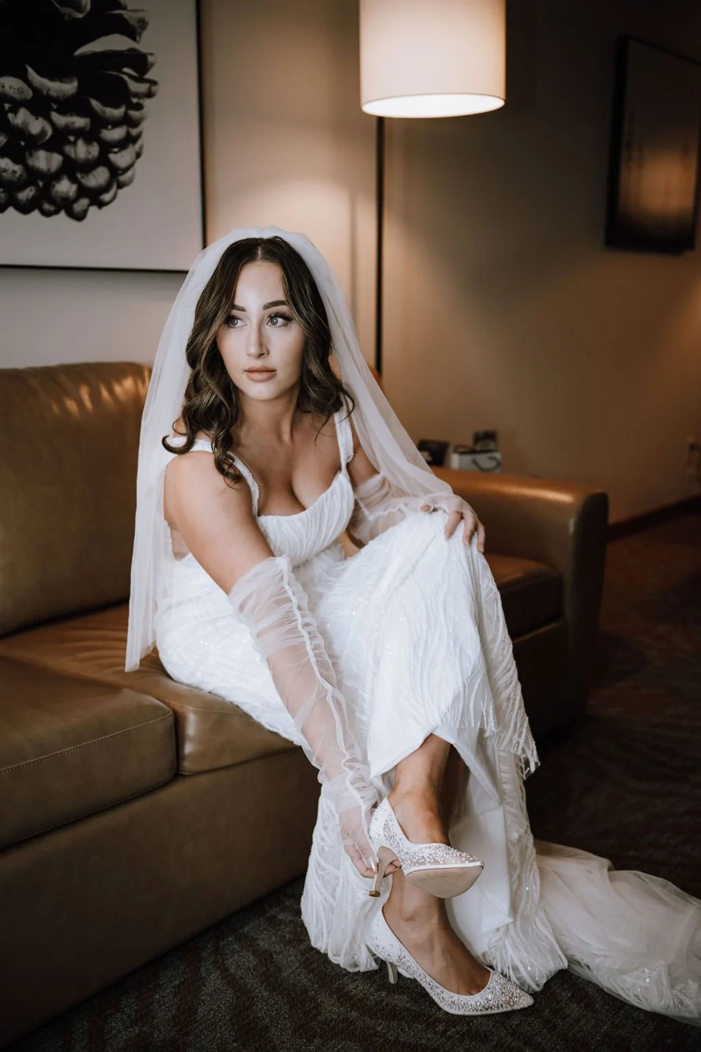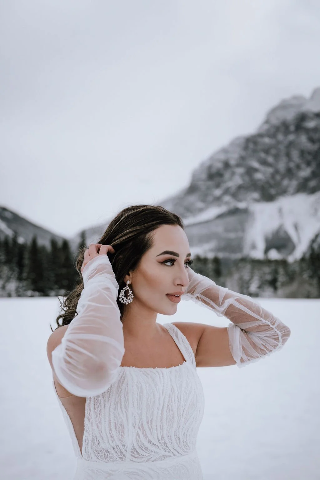 Danielle was absolutely radiant. Her dark hair and striking eyes stood out beautifully against the snow and the soft white tones of her gown. The dress itself was a showstopper, featuring intricate beading that caught the light with every movement. It was elegant, timeless, and perfectly suited for the winter setting.