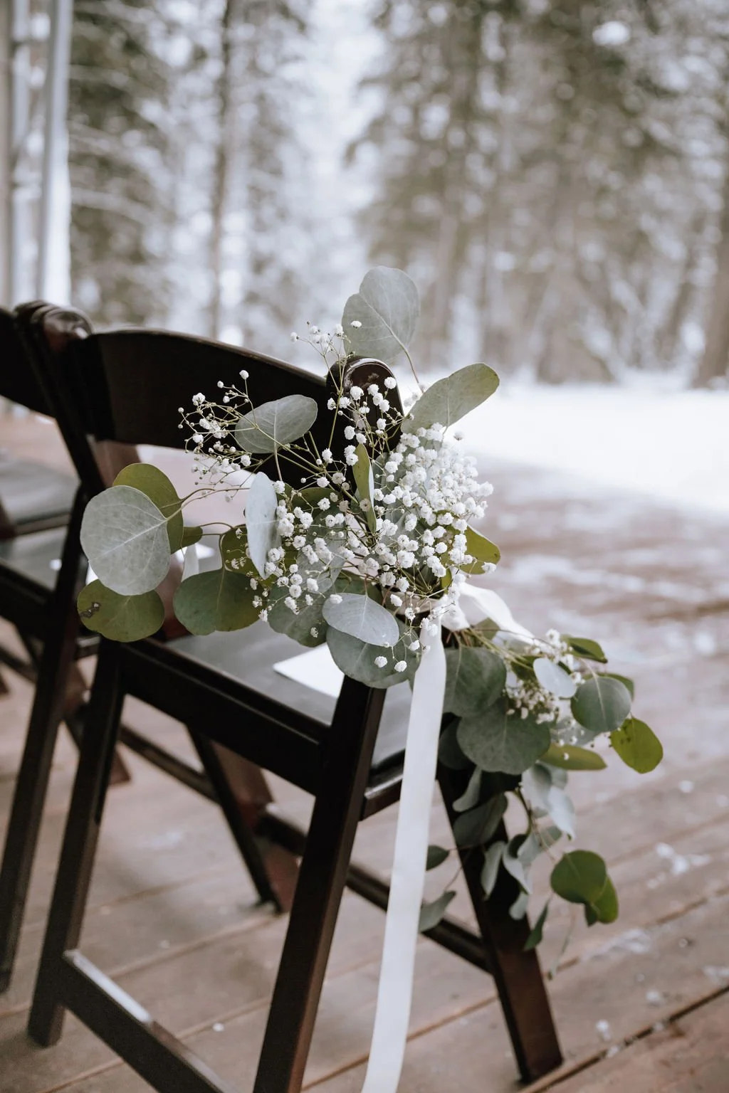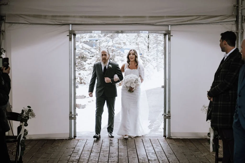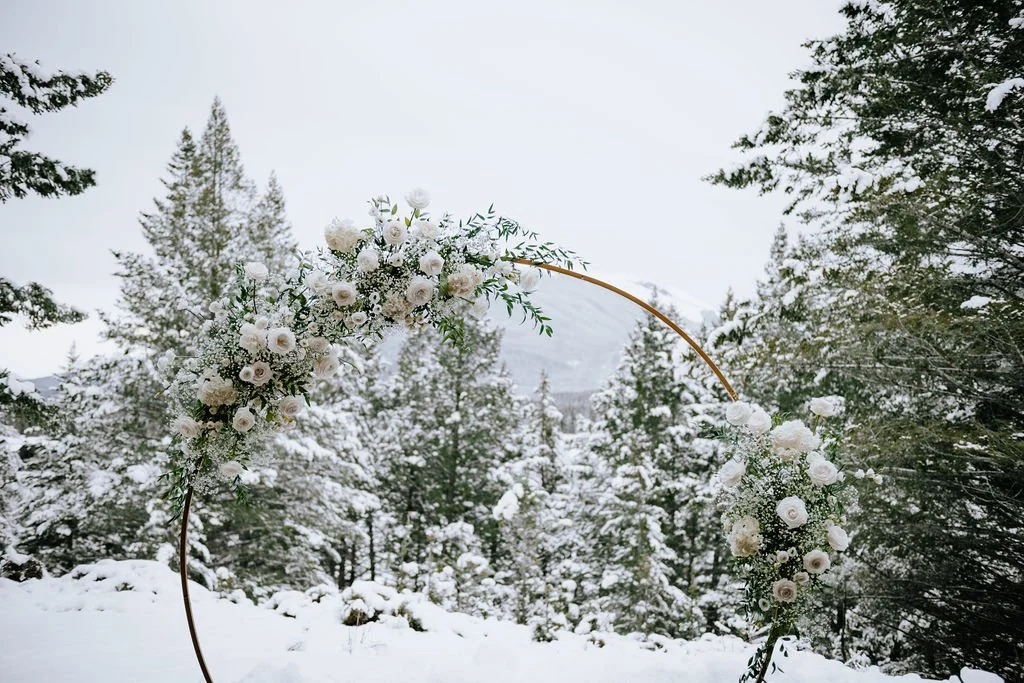 The ceremony design mirrored the natural beauty around them. Willow Flower Co. created a stunning florals for the arch, filled with white blooms and touches of greenery, blending seamlessly into the snowy forest backdrop. It felt organic, romantic, and effortlessly alpine. As Danielle and Ryan exchanged vows, their breath visible in the cold mountain air, there was something incredibly moving about the contrast. The temperature may have been chilly, but the moment was filled with warmth, emotion, and so much love.