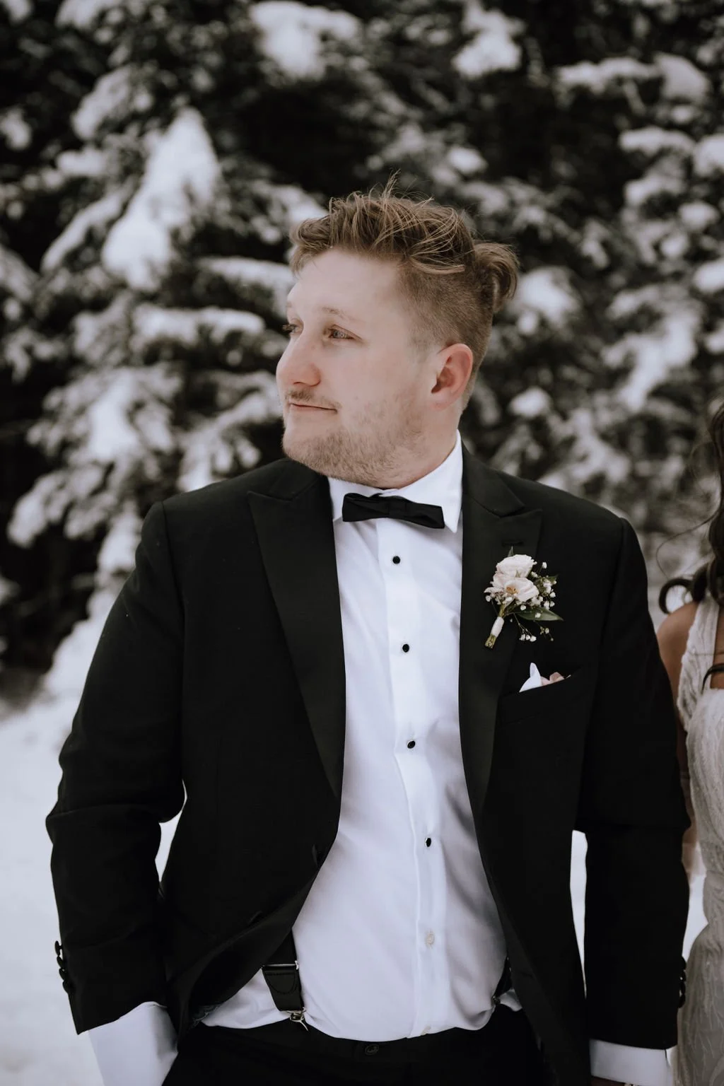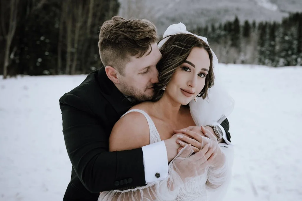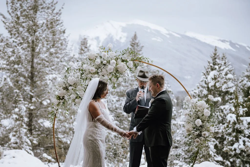 Their ceremony took place outdoors, backed by dense evergreens and snow-covered mountains that looked straight out of a postcard. Overnight snowfall had transformed the entire landscape, coating every branch and ridge in fresh white powder. It was one of those rare winter days where everything feels still, quiet, and incredibly special.