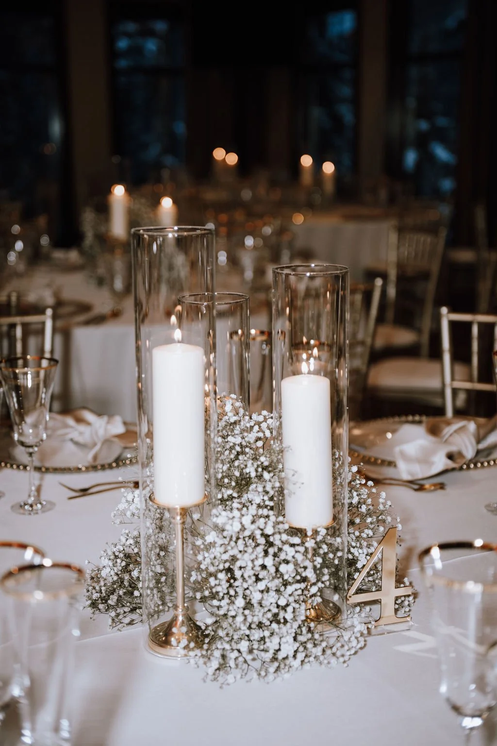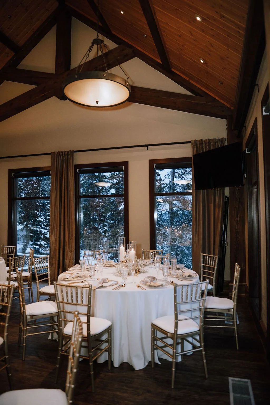 The reception space was elevated with thoughtful details that kept the winter palette refined and romantic. White table linens paired with gold chairs, glowing candlelight, delicate baby’s breath arrangements, and gold cutlery created a soft, luxurious feel without overpowering the natural charm of the venue. Decor pieces from Mountain Event Rentals and Modern Rentals tied everything together seamlessly, bringing both texture and elegance into the space.